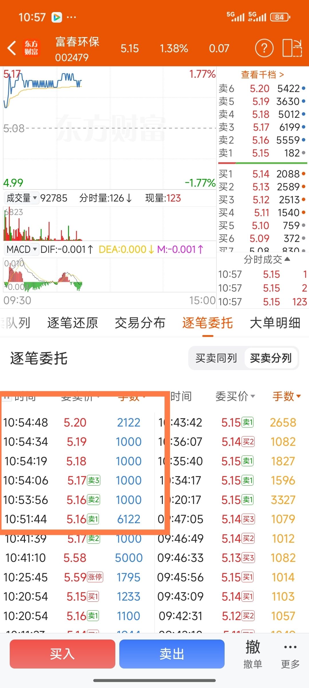 $富春环保(SZ002479)$ 挂了单笔6122手卖单,但没主动买盘,然后拆成四笔1000手与一笔2122手