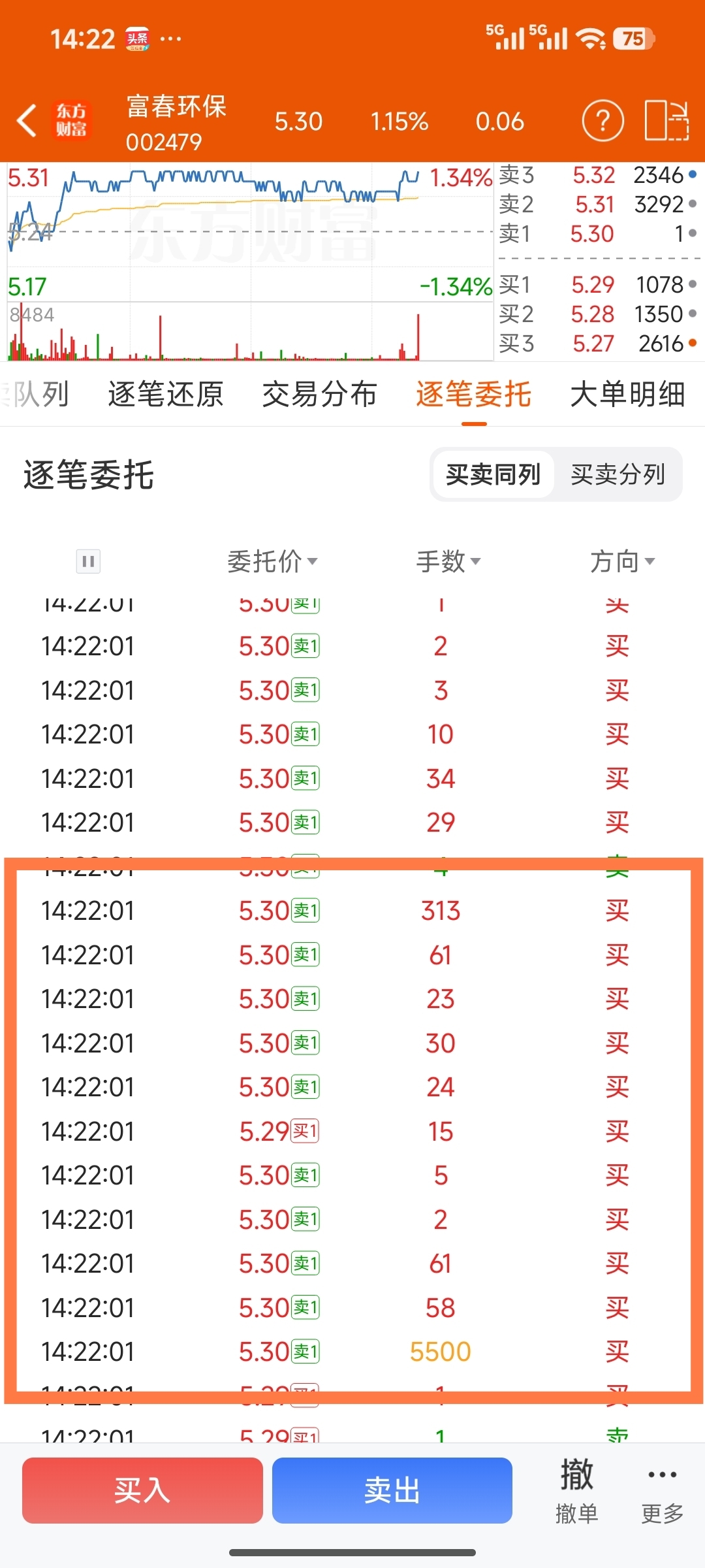 $富春环保(SZ002479)$ 这些单把6000手分拆的几百笔卖单干掉,希望不是自买自卖对敲