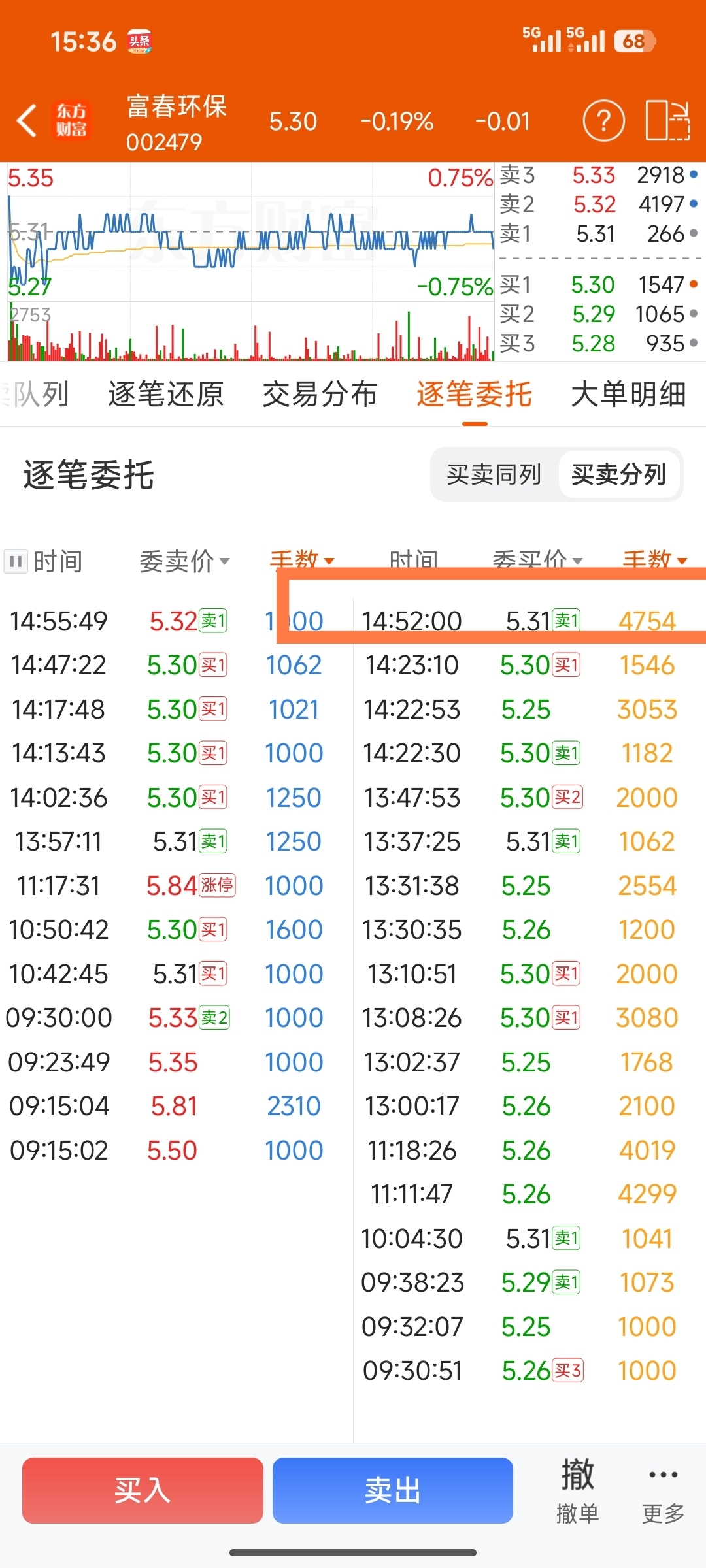$富春环保(SZ002479)$ 今天单笔大单对比上个交易日大幅减少,最牛的就是今天挂买一的单笔买单4754手全部已成交