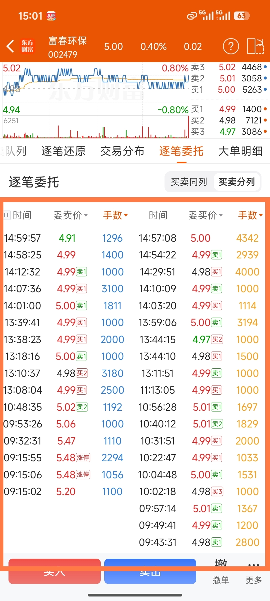$富春环保(SZ002479)$ 今天单笔大买单多于卖单,当然里面也有些卖盘上筹码是自己放上去买,然后自卖自买对倒