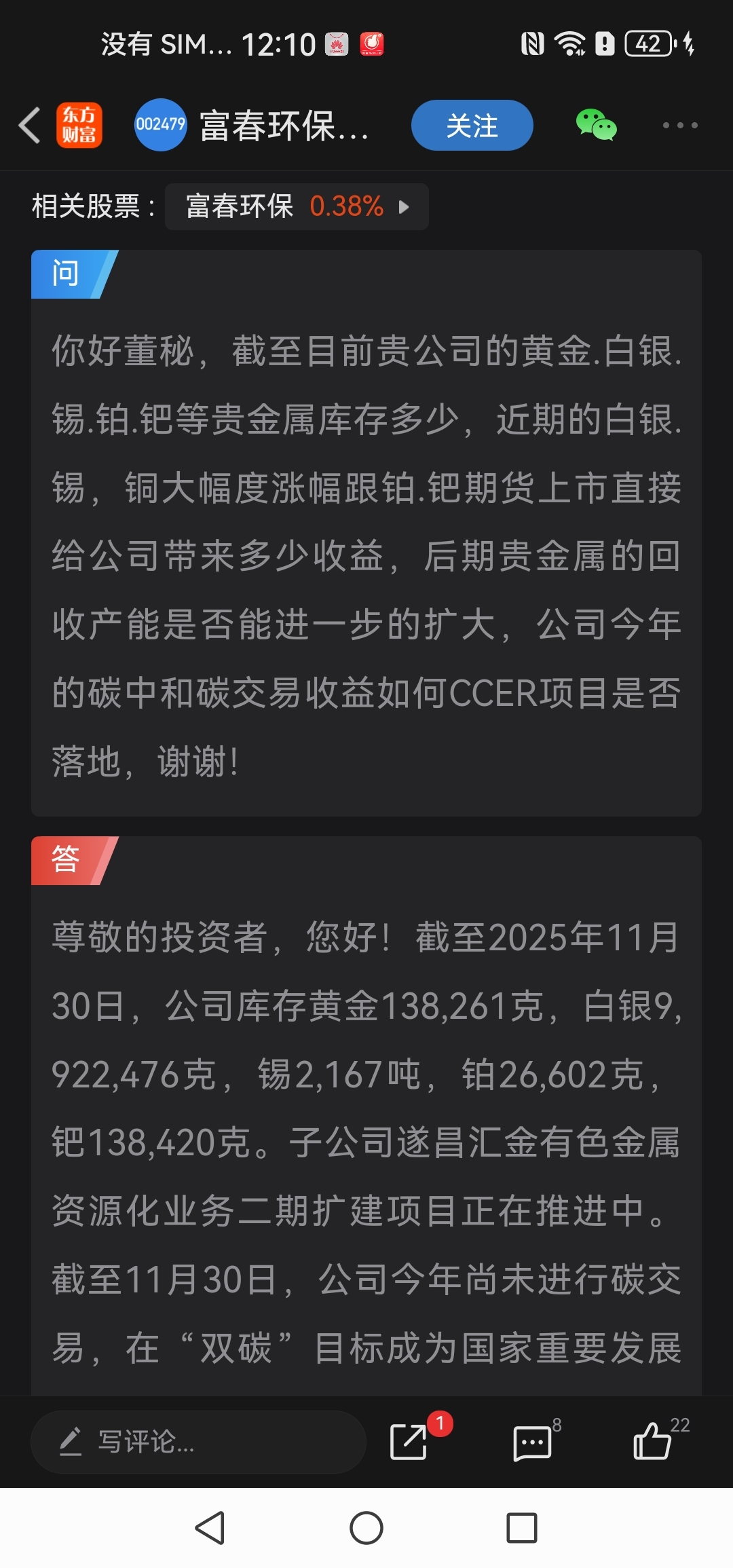 $富春环保(SZ002479)$ 库存一吨白银,等贵金属,央视网报道白银4个月涨了倍,公司赚大发了,主要是还有很多人不知道公司有色销售额有10多亿。