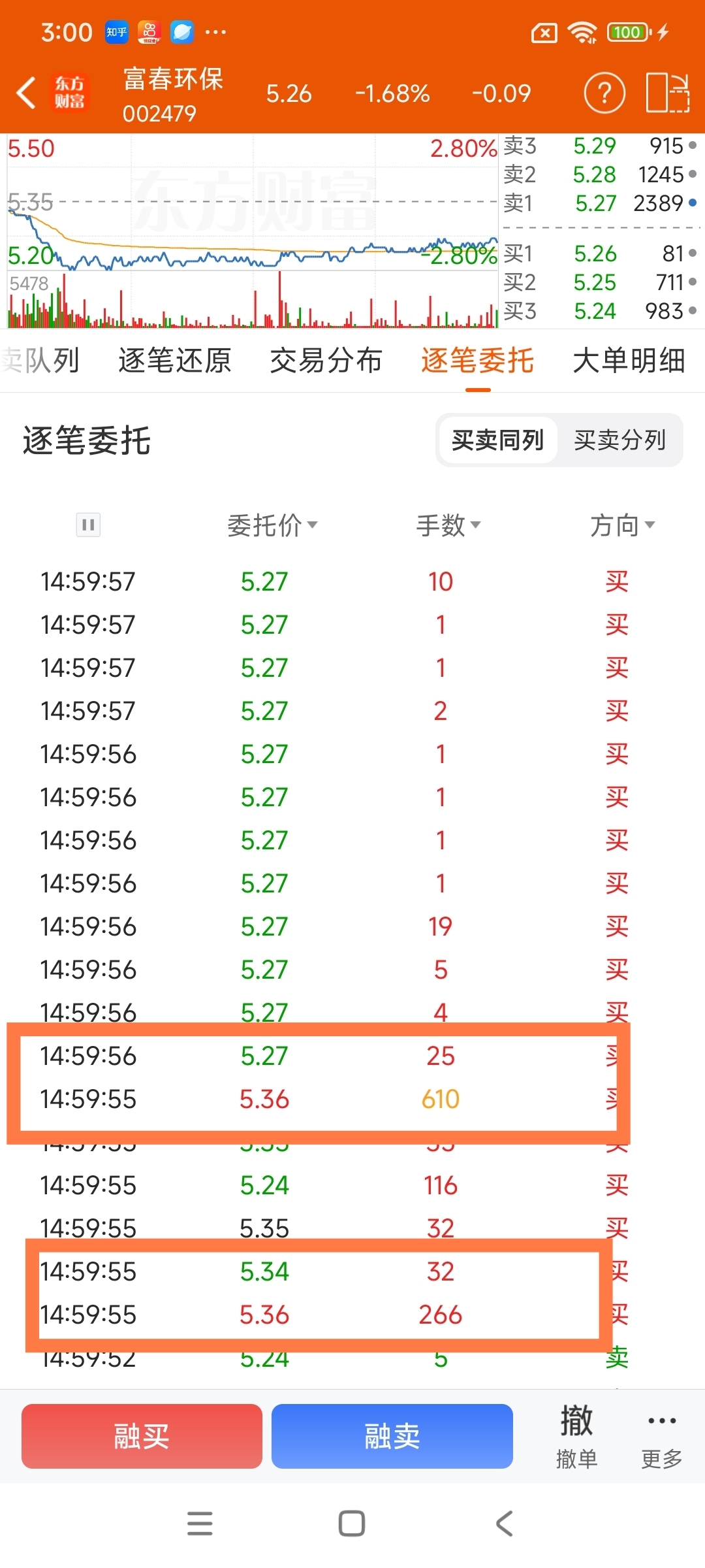$富春环保(SZ002479)$ 幸亏这个大户最后五秒打出5.36元两笔
