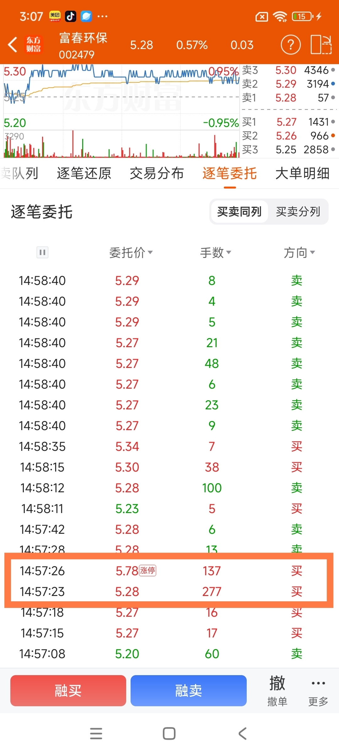 $富春环保(SZ002479)$ 大家要感谢这两个散户,尾盘竞价时出了力,不然今天会少涨1分