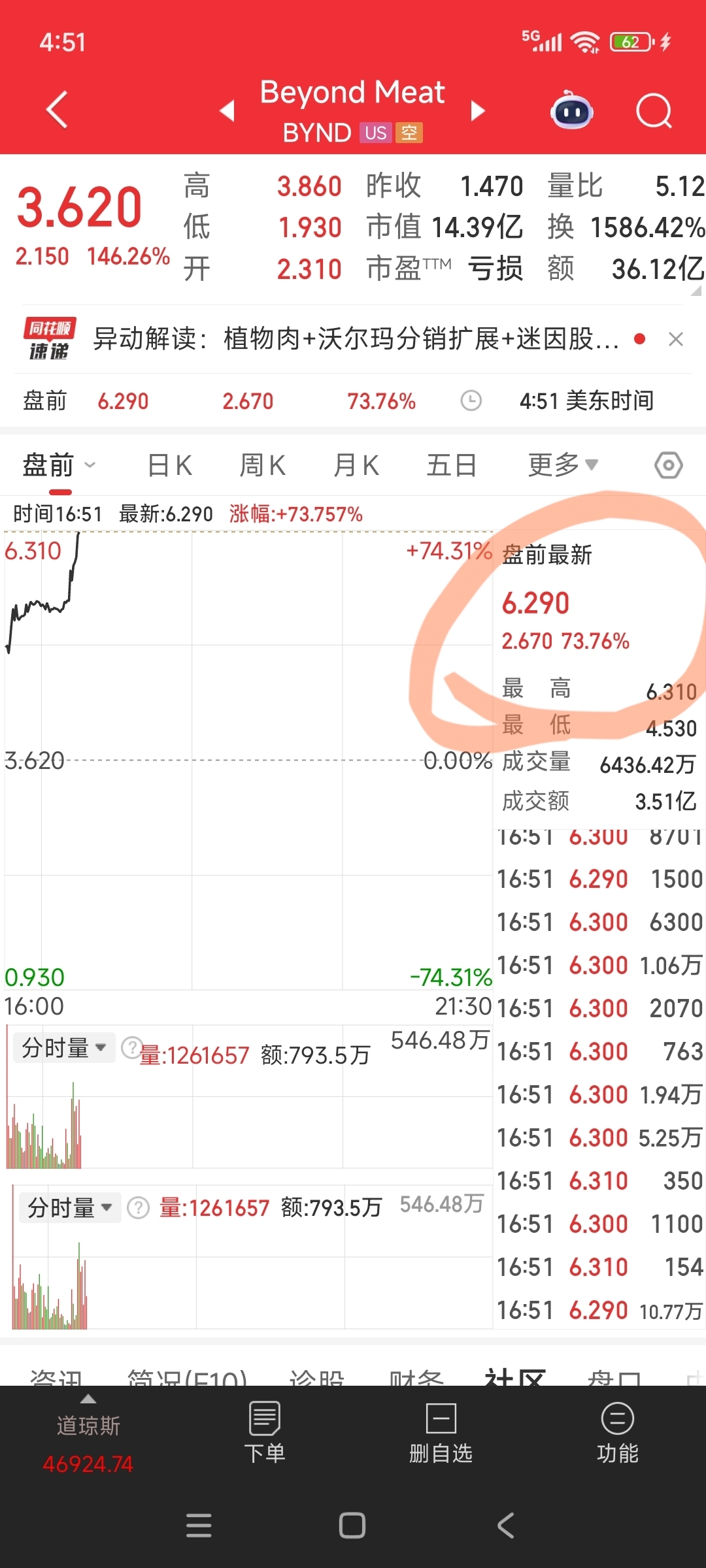 $双塔食品(SZ002481)$ 美股人造肉盘前70个点了