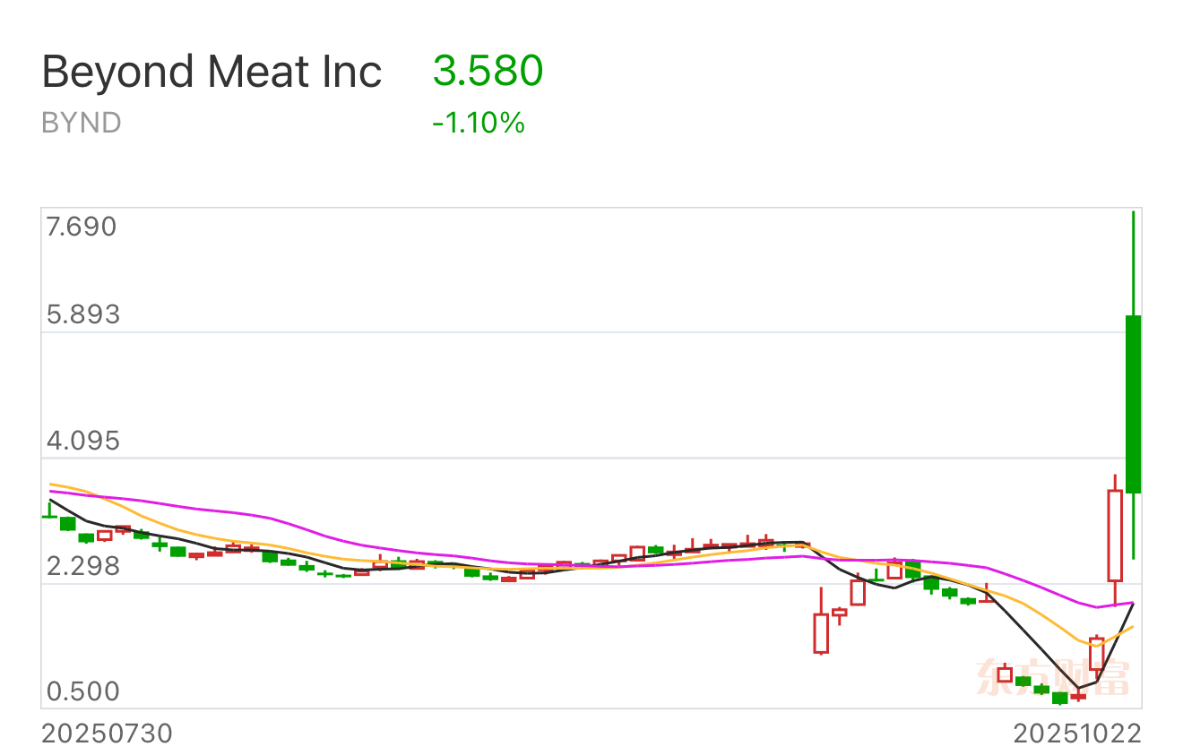 Beyond Meat(BYND.US)股价连续多日放量反弹,成交量翻倍。