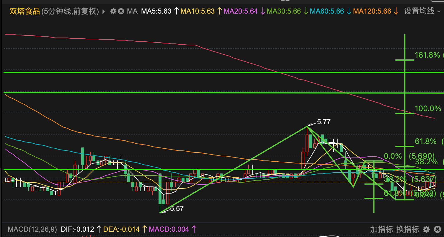 早盘分享 昨天有说过在5.67上下就可以逐步进场了 只要不跌破5.57都是安全的 哪怕打到5.67-5.65之间都是安全的 只需等到30分钟再次站上五日线 突破5.77在回踩那就可以上大仓位了