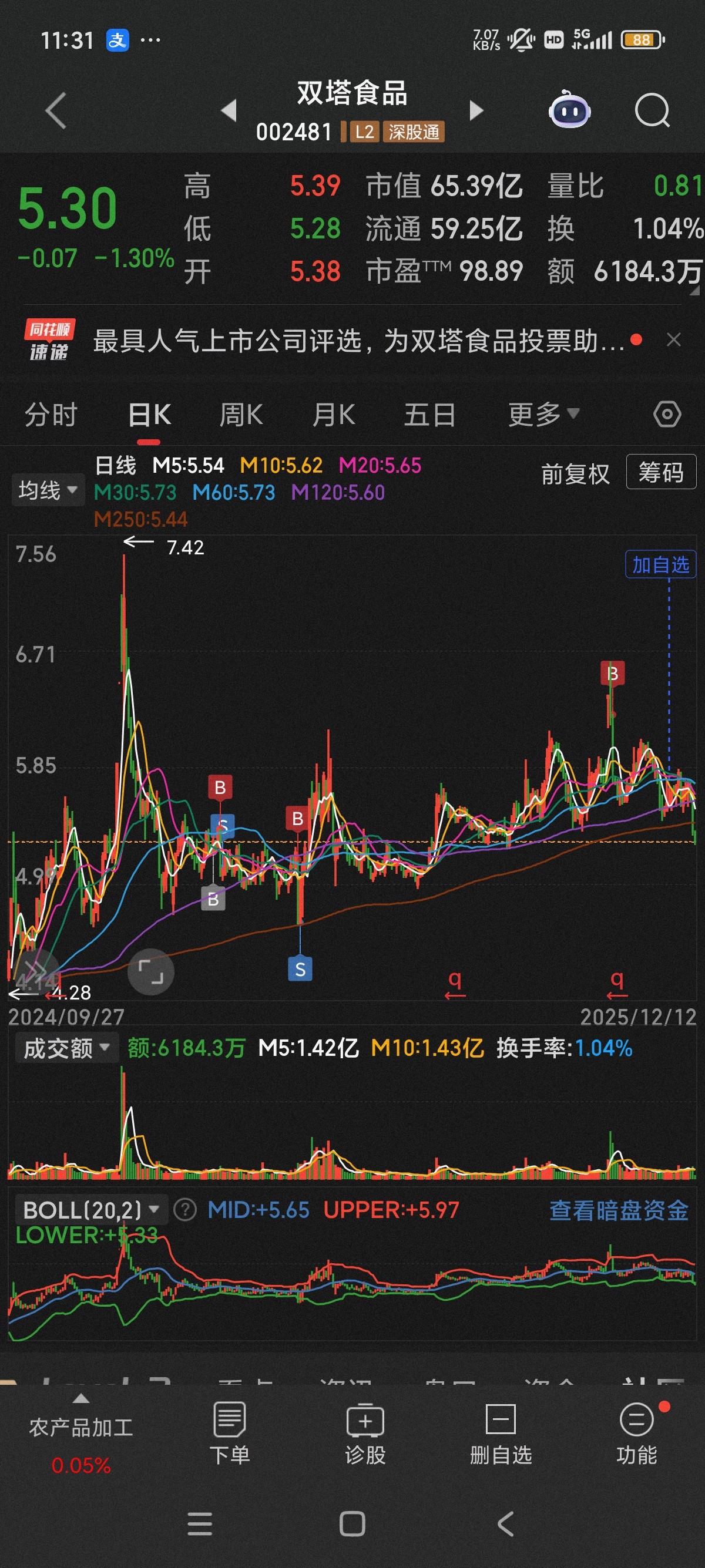 $双塔食品(SZ002481)$ 最多赚了20没卖,目前亏损了