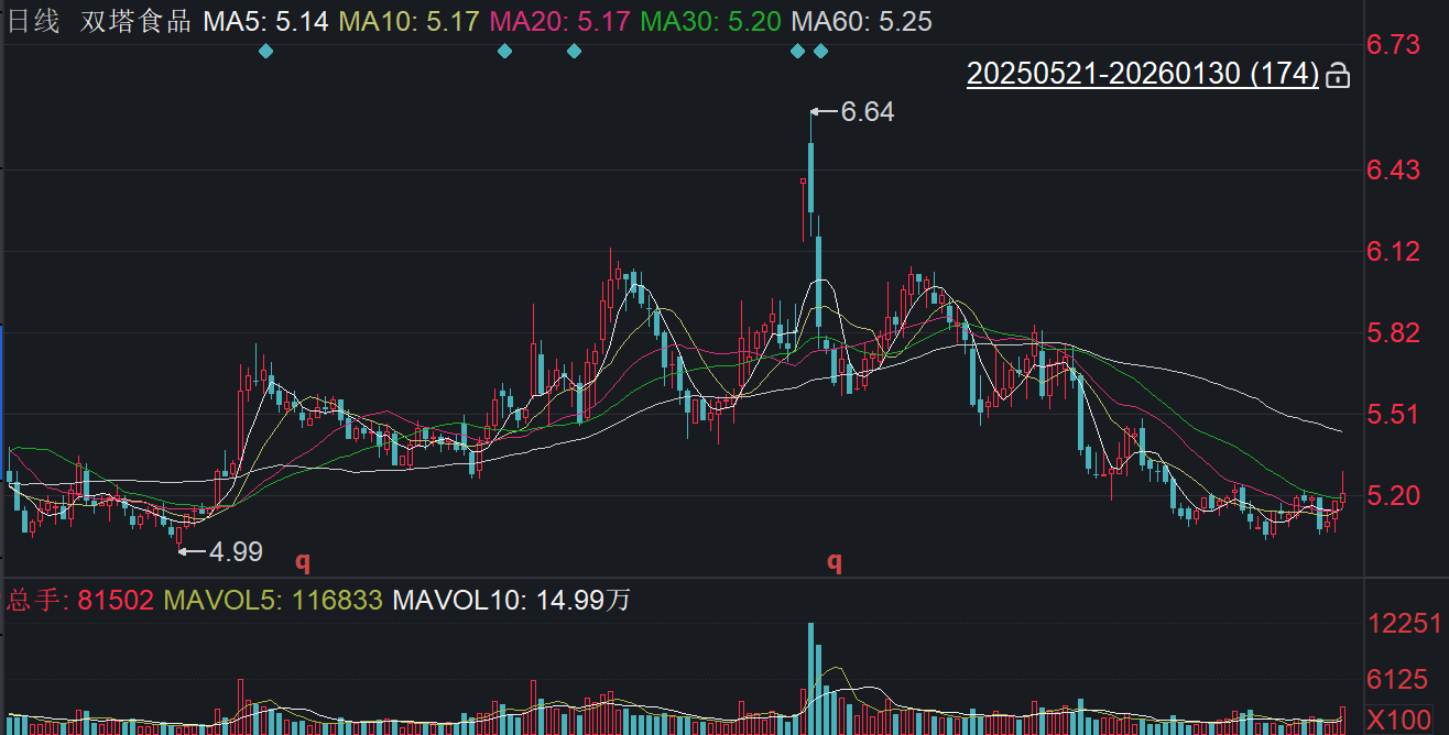 二级市场上,截至1月30日收盘,双塔食品上涨0.58%报5.21元/股,总市值约64.28亿元,近一年来公司股价近乎“原地踏步”。