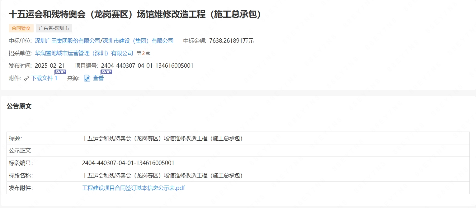 广田联合体中标十五运会和残特奥会(龙岗赛区)场馆维修改造工程(施工总承包)
