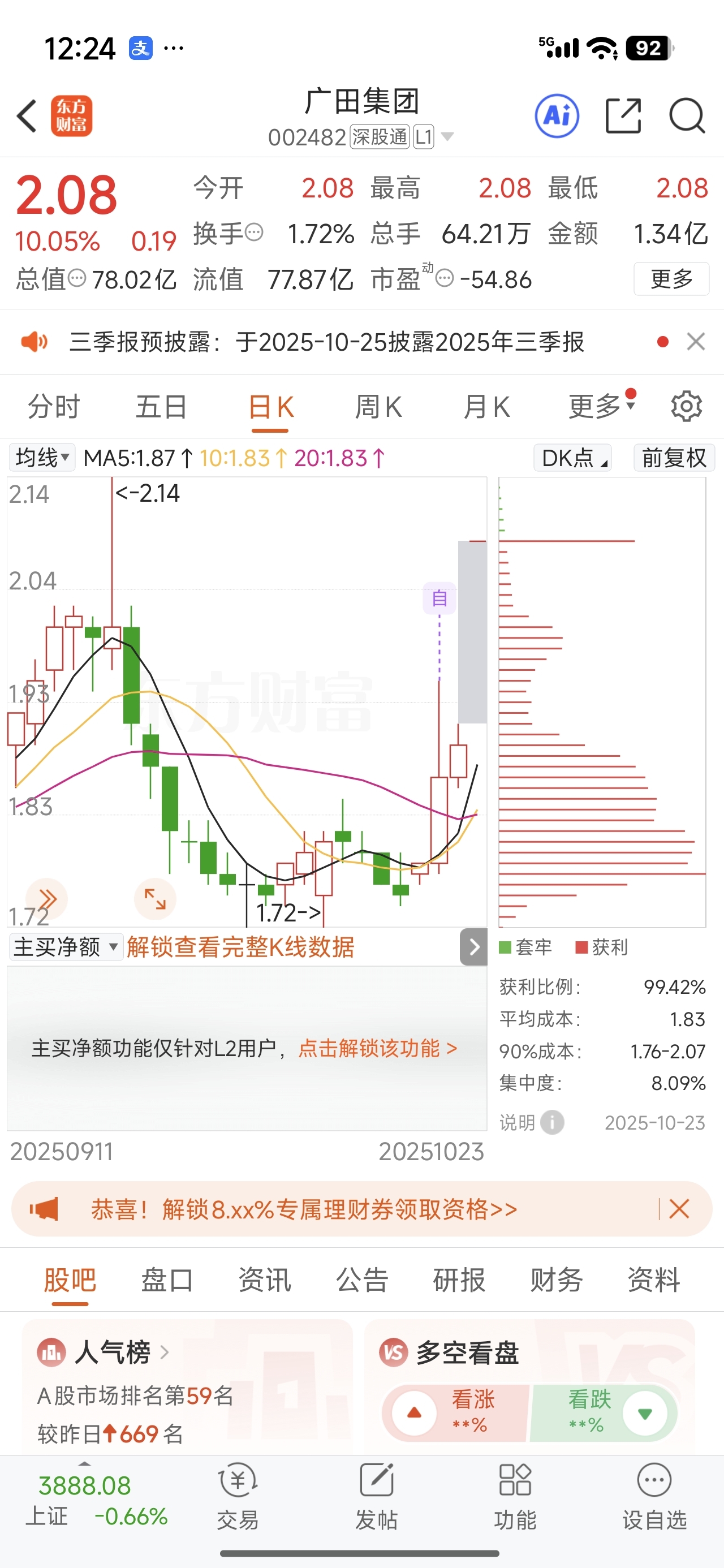 $广田集团(SZ002482)$ 真服了自己,前天看了盘,加入自选,昨天还是1.88想买,后面二选一选了苏宁环球,最近好累啊,应该要空仓才对