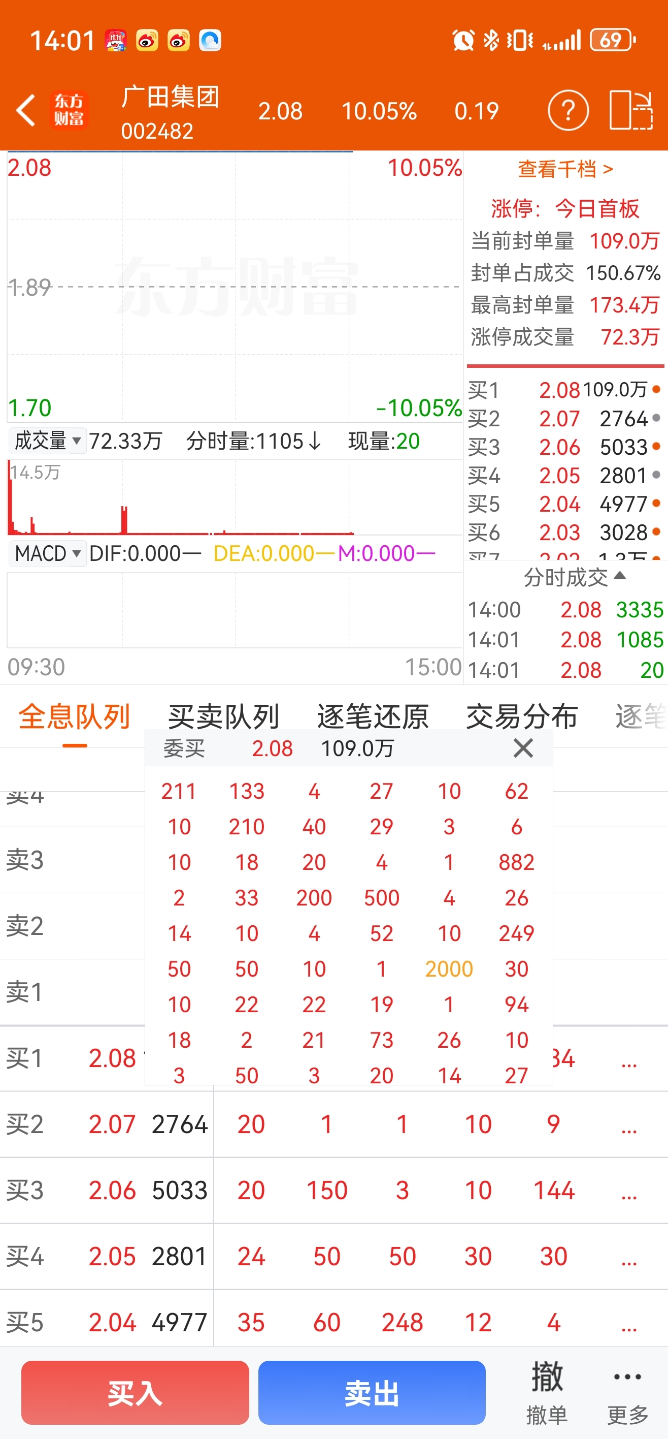 $广田集团(SZ002482)$ 都是散单排在前面,慌不慌?看到好几次快到大单接盘的时候迅速撤了,然后再重新挂单,然后单子就排到后面去了,这种还不会显示封单大幅减少,都是很贼的。小心一点