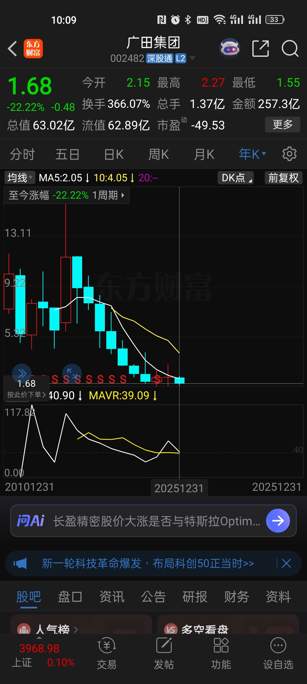 $广田集团(SZ002482)$ 年线跌了22个点,主要是今年是大牛市啊,你竟然逆境跌了22个点!!!!