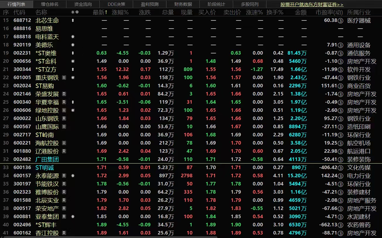 广田集团今日午盘收市股价1.71元/股,沪深京排行榜倒数第十四位,排名不断往前,离退市不远!