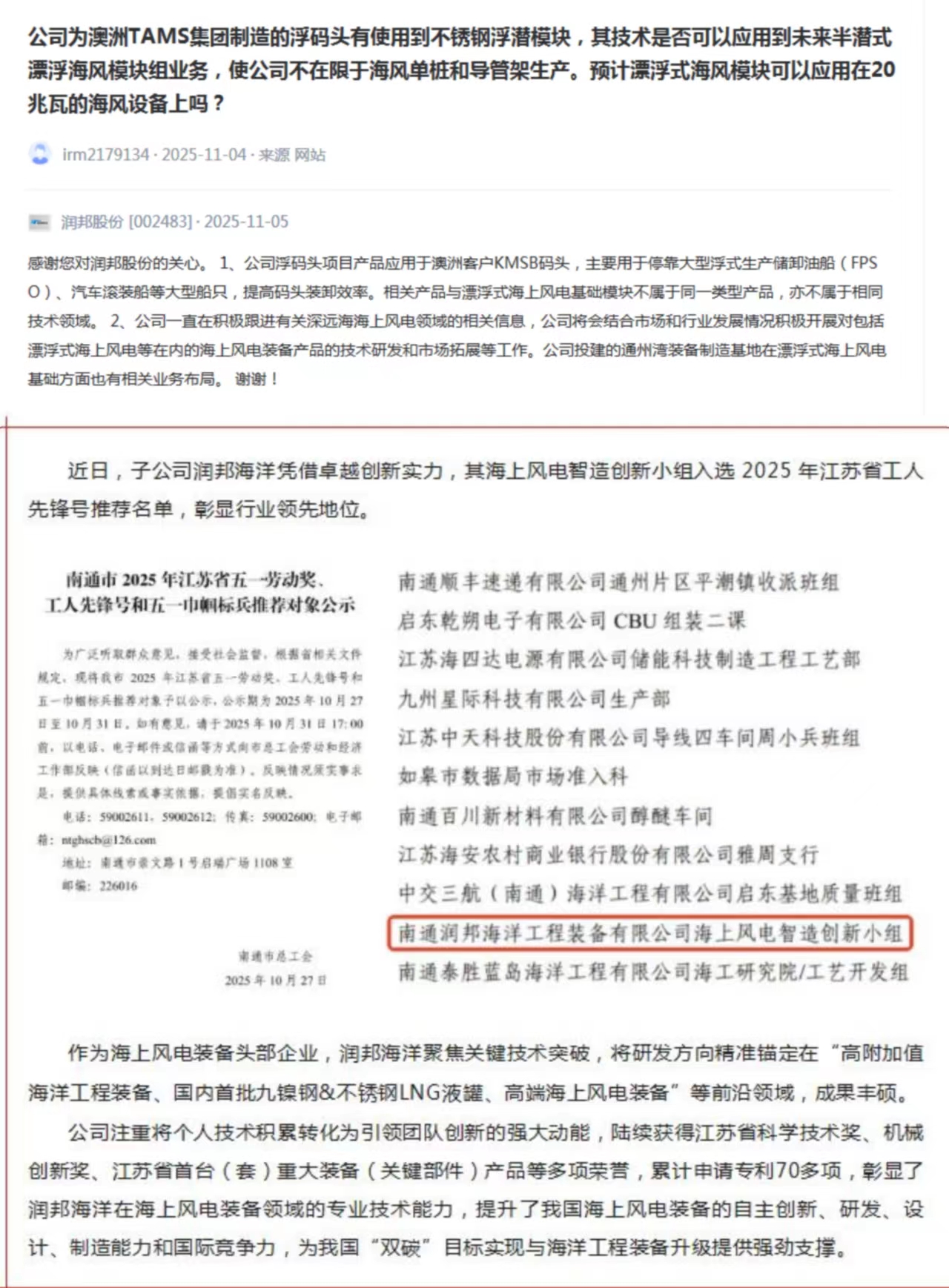 远深海风电爆发,润邦的漂浮式平台要爆单?光盐城就规划了25.6GW占计划海风发电总额的73%!润邦海洋凭借卓越创新实力,其海上风电智造创新小组入选 2025 年江苏省工人先锋号推荐名单,彰显行业领先地位。作为海上风电装备头部企业,润邦海洋聚焦关键技术突破,将研发方向精准锚定在“高附加值海洋工程装备、国内首批九镍钢&不锈钢LNG液罐、高端海上风电装备”等前沿领域,成果丰硕。