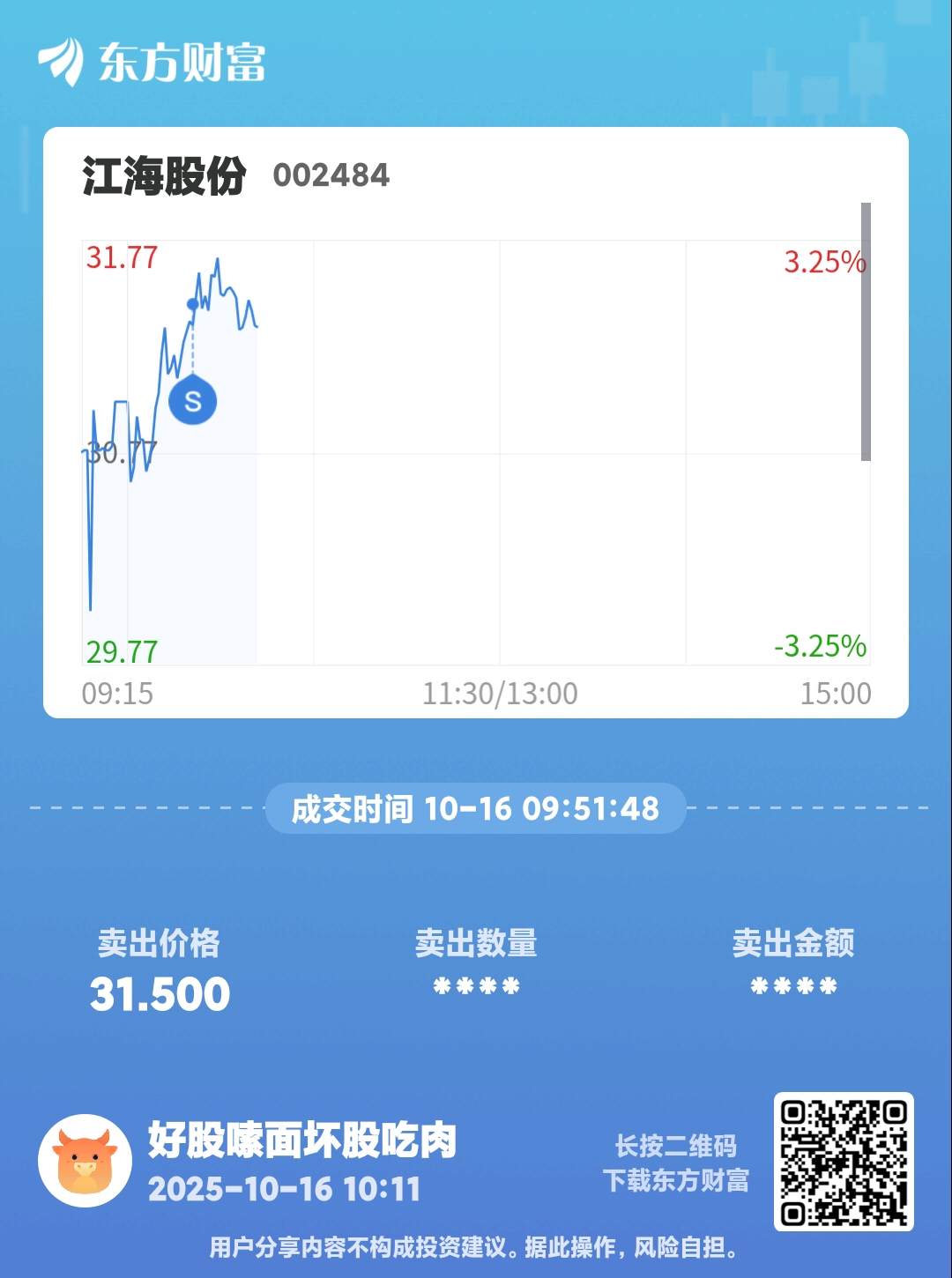 $江海股份(SZ002484)$ 人都套麻了,今天感谢主力帮我解套,小挣几天饭钱,等突破前高再回来