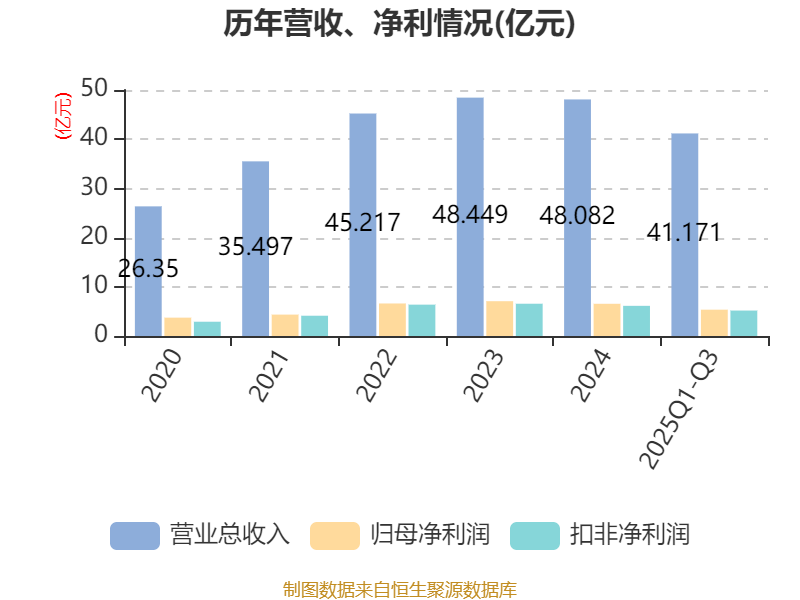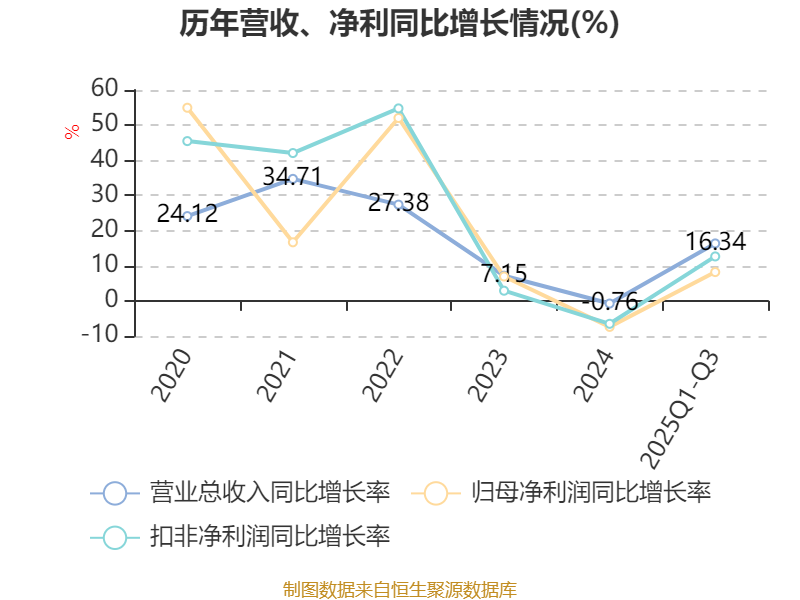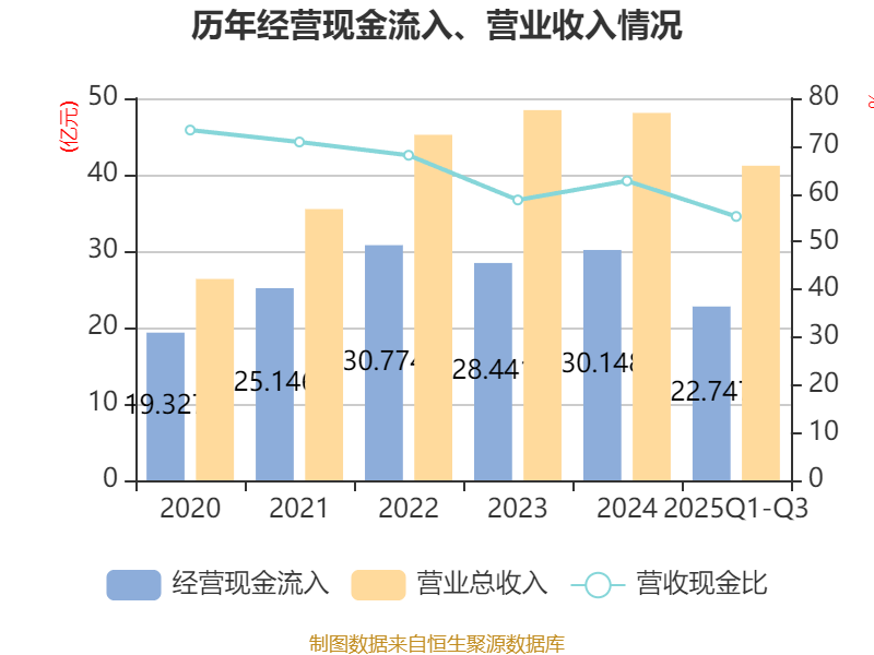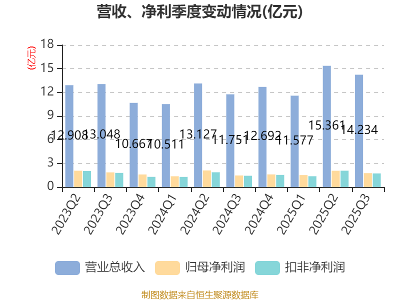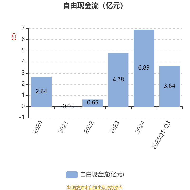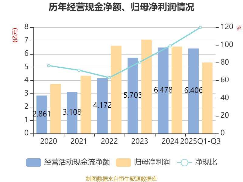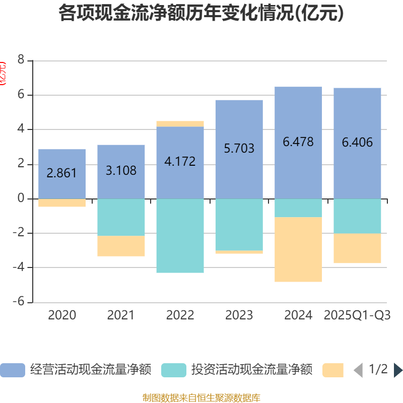 2025年前三季度,公司经营活动现金流净额为6.41亿元,同比增长54.63%;筹资活动现金流净额-1.71亿元,同比增加1.56亿元;投资活动现金流净额-2.02亿元,上年同期为-1.88亿元。