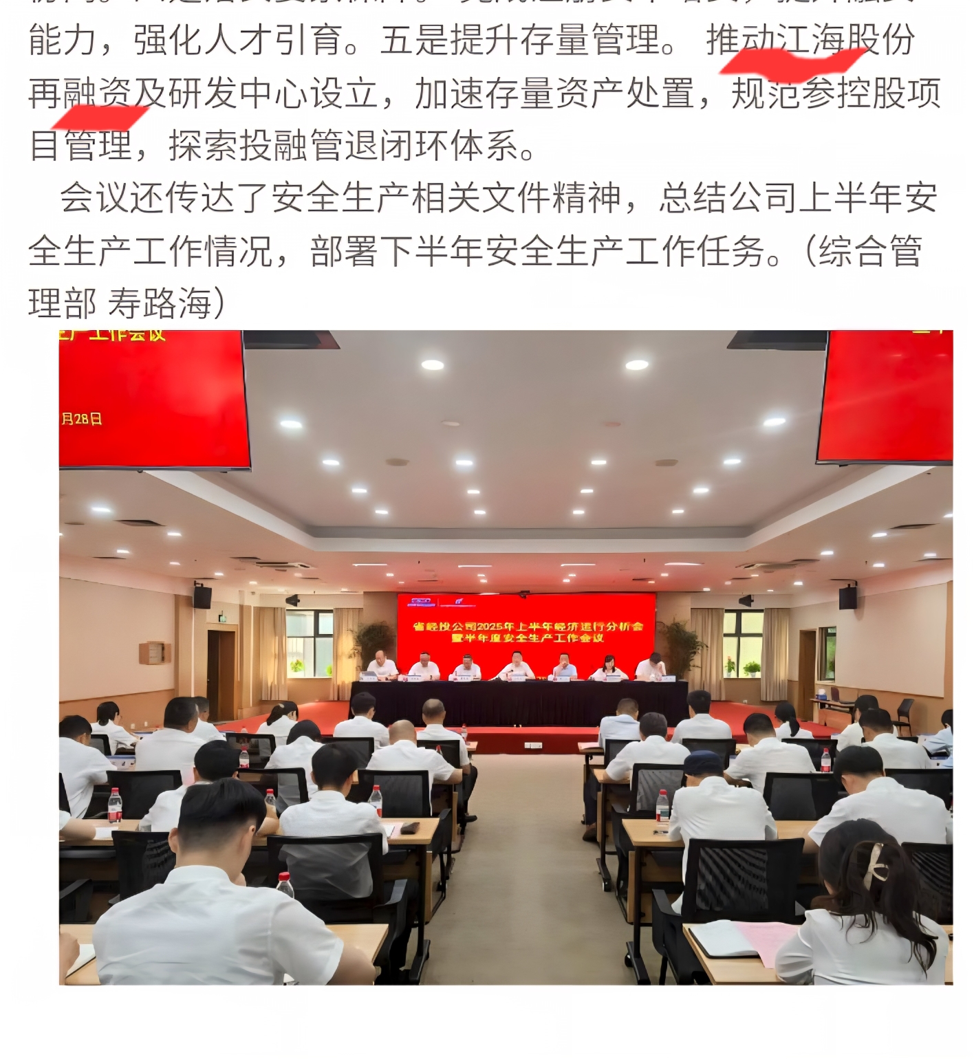 大股东半年度工作会议明确提出了江海股份要再融资,大股东想低价参与定增,巩固控股地