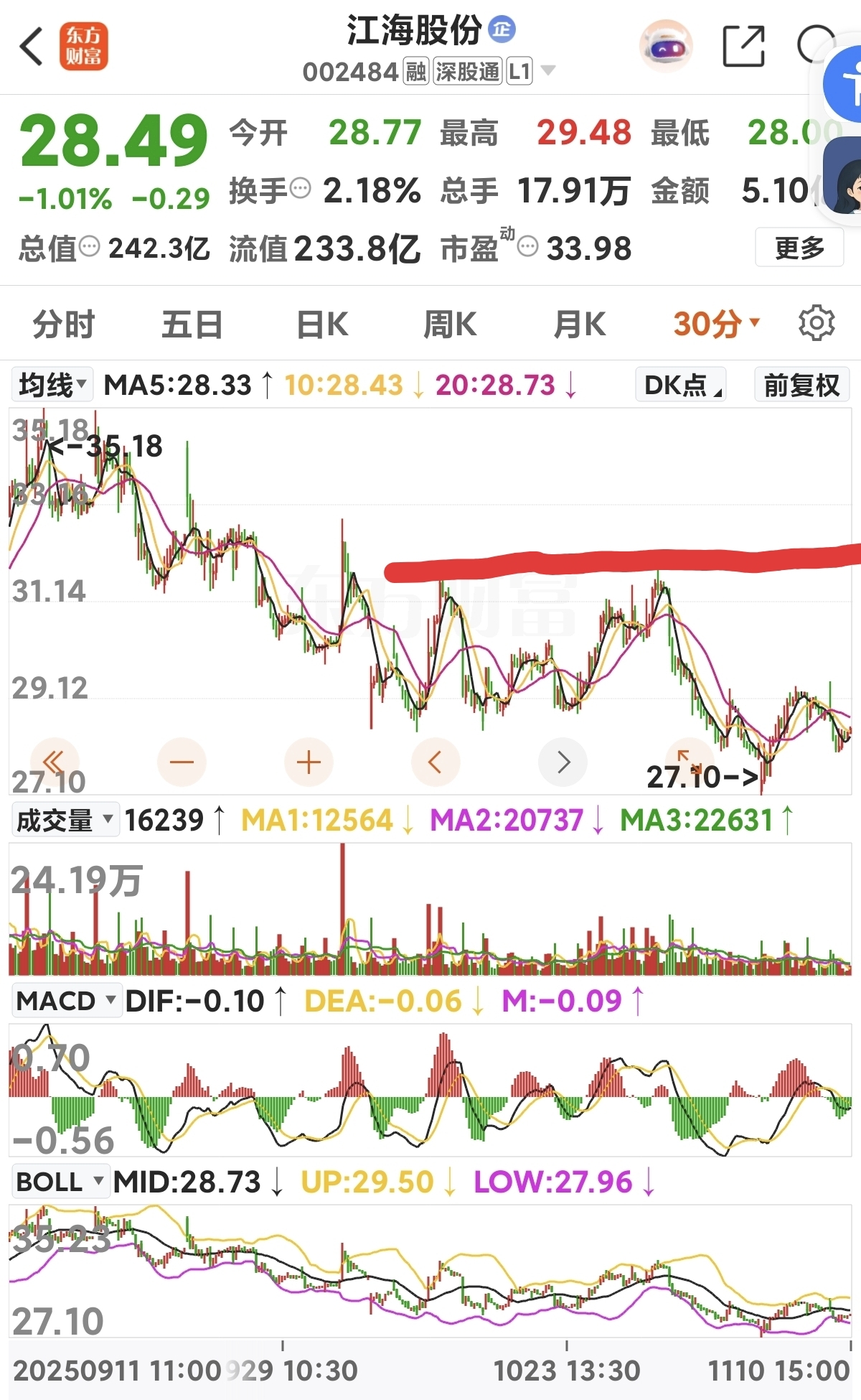 30分钟,走了一个头肩底,27.1这个位置,底背离明显,目前看是否完成这个形态,