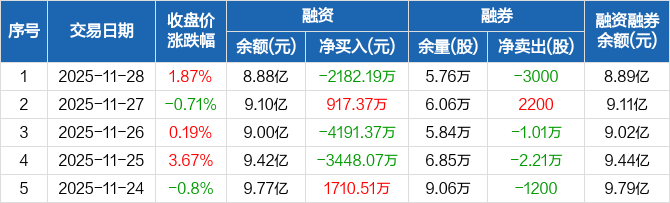 江海股份:融资净偿还2182.19万元,融资余额8.88亿元(11-28)