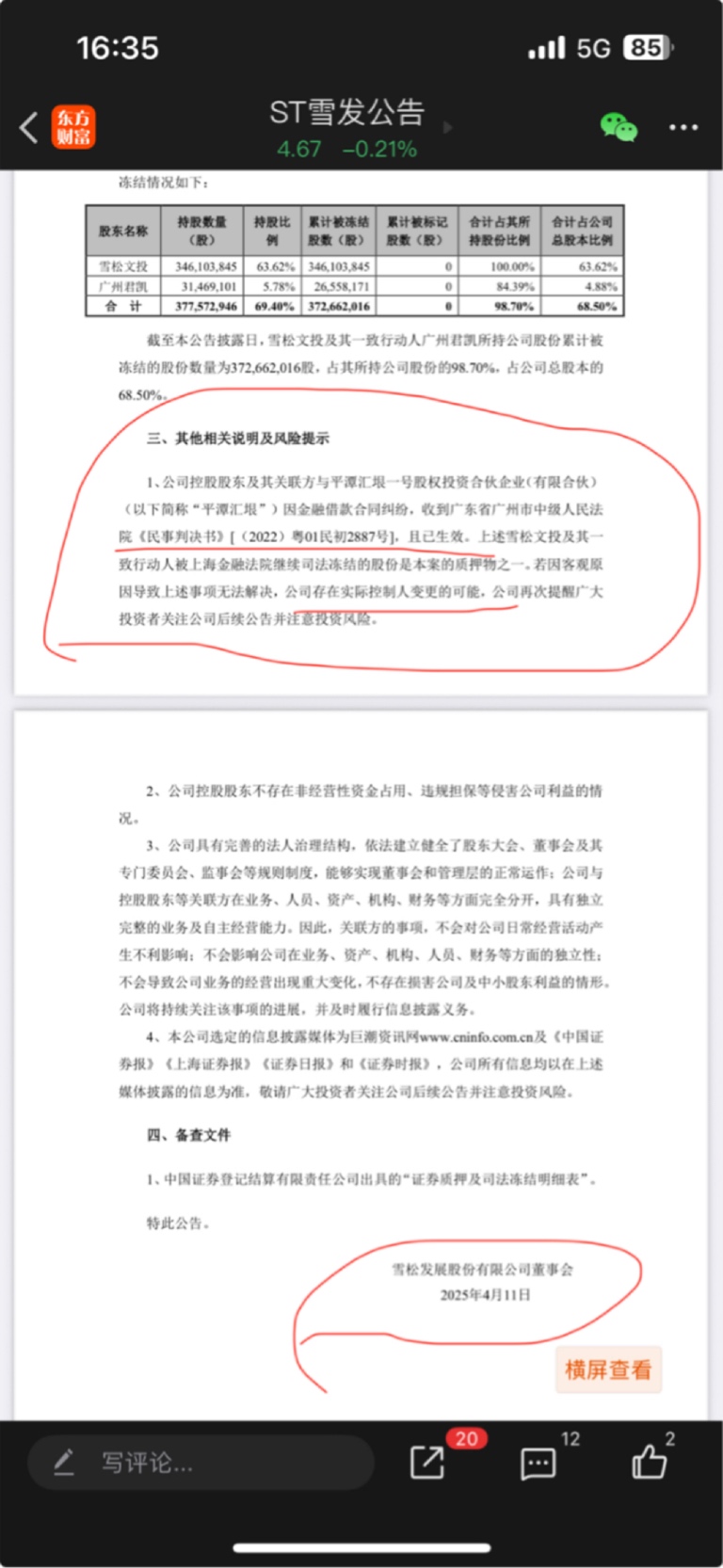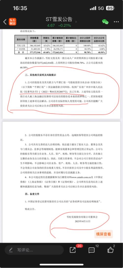 铁证!雪发4月11号早已公告判决书已经生效,到目前为止10月份刚刚好半年可以采取执行拍卖控股权变更。这个也足够对上10月20号长安国信要上架了,现在只是需要通知小债权人再上拍卖。长安国际信托作为持有3.72亿股质押股份的质权人,债权本息约22.5亿元,其依法有权申请司法拍卖质押股权以实现债权,且目前已具备重启拍卖的司法条件。@一天一天做 @烽烟纵横 //@谷子33 :长安国际信托原计划10月20日在阿里拍卖ST雪发3.775亿股这件事是真实的。不过该拍卖因少数案外人小额债权待确认被法院建议暂停,且相关遗留问题已于10月30日解决。可以通过专业财经平台、司法相关信息渠道查询到该事件的相关信息,具体如下:司法及拍卖关联信息渠道:此次拍卖源于股权质押违约后的司法处置,广州法院相关执行案件(如案号(2024)粤01执1375号)的进展可通过中国执行信息公开网查询;而阿...