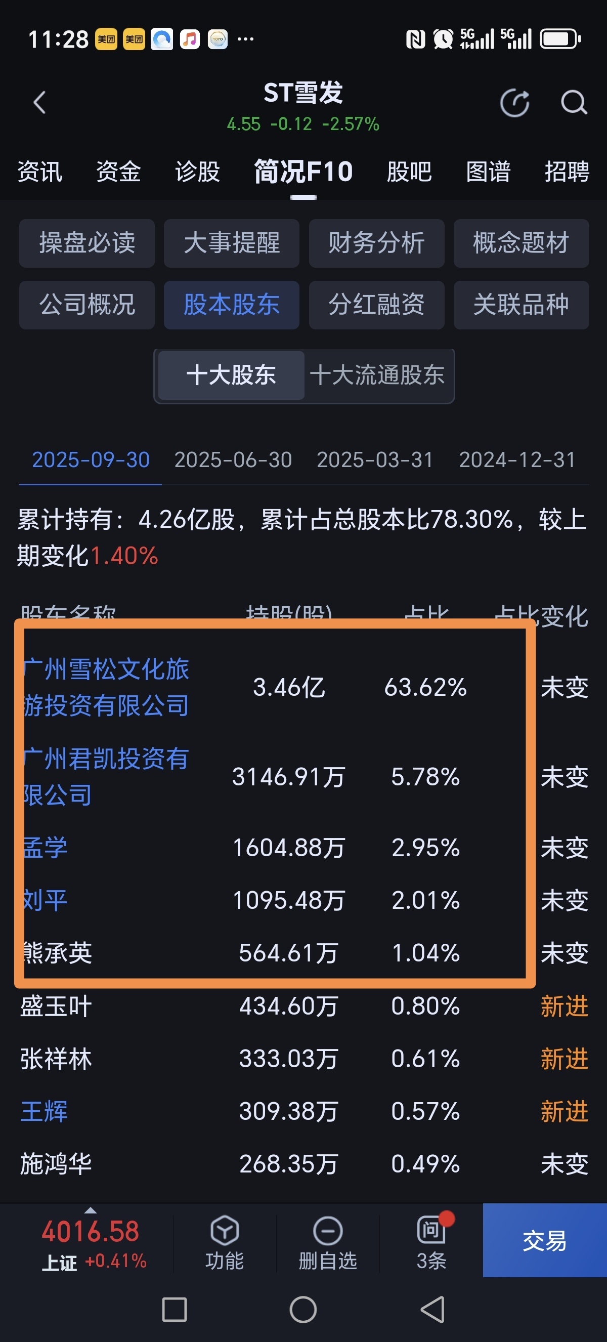 研究股本结构都知道:大股东高占比持股最适合借壳上市、上纬新材就是典型案例大股东持70%多一次买下就可借壳、而st中迪大股东仅占20%多借壳方控股不大稀释股权收益不大,st雪发一致行动人持股70%而且公司独立运营不受雪发集团事件影响是最佳壳标地、买完雪藏、别在意短线干扰!