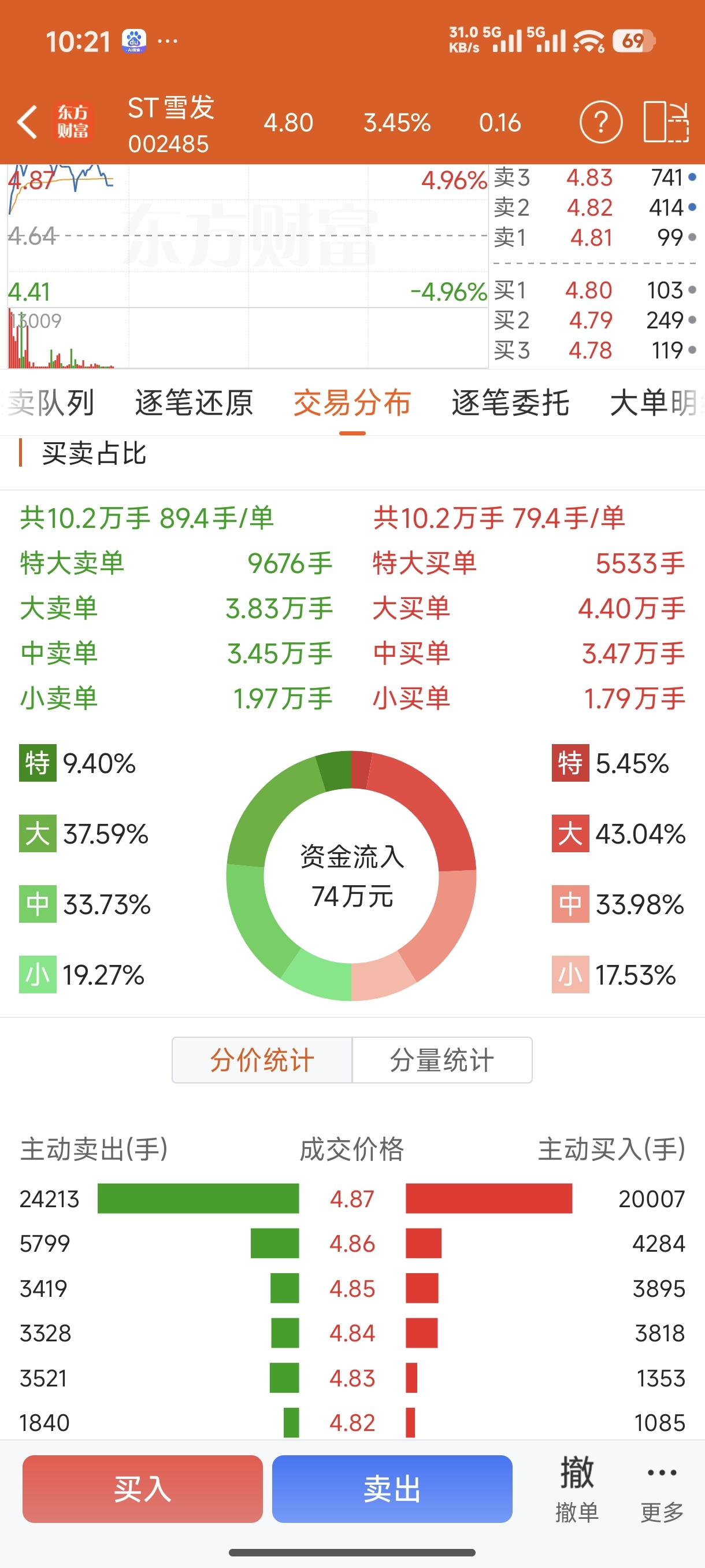 大单都差不多,没有啥大单买小单卖的说法,也没有啥大单卖小单买,不要自欺欺人看多或看空,直接梭哈,总就五个亿的流通盘,8000散户一人也就五万,低于五万元的散户就卖了吧