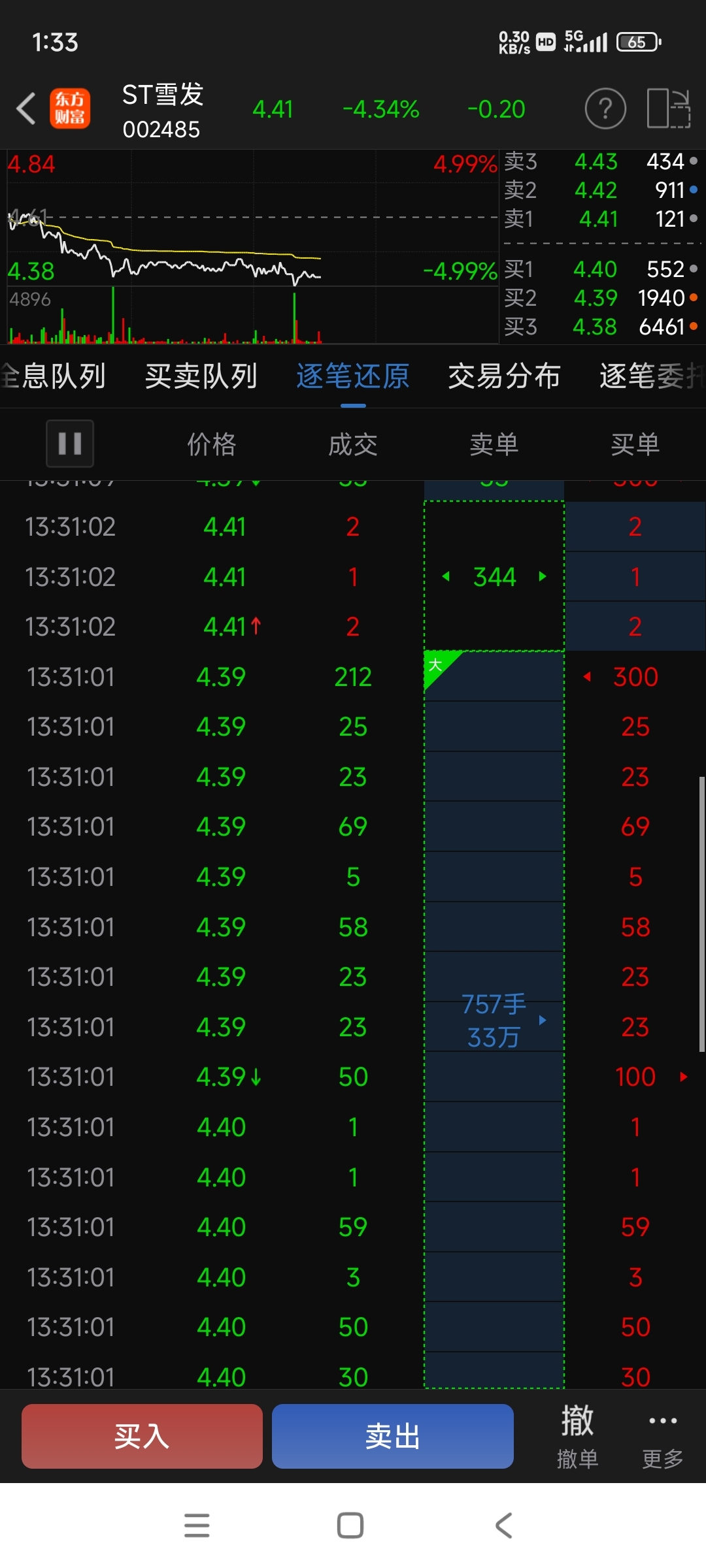 $ST雪发(SZ002485)$ 看看他们怎么操作的,先卖出757,马上分三次买入5手,就会显示红盘买入762手