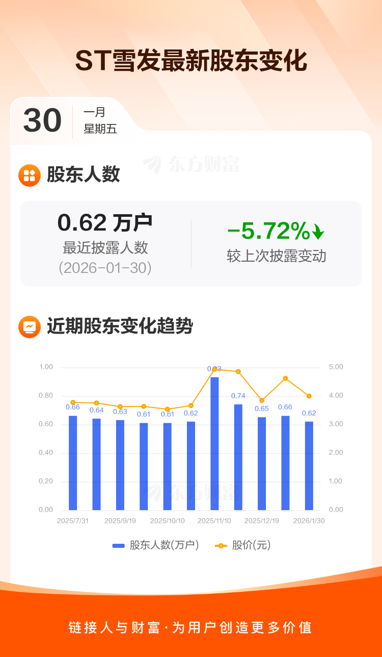 ST雪发:截至1月30日最新股东户数6236户,较上期减少5.72%