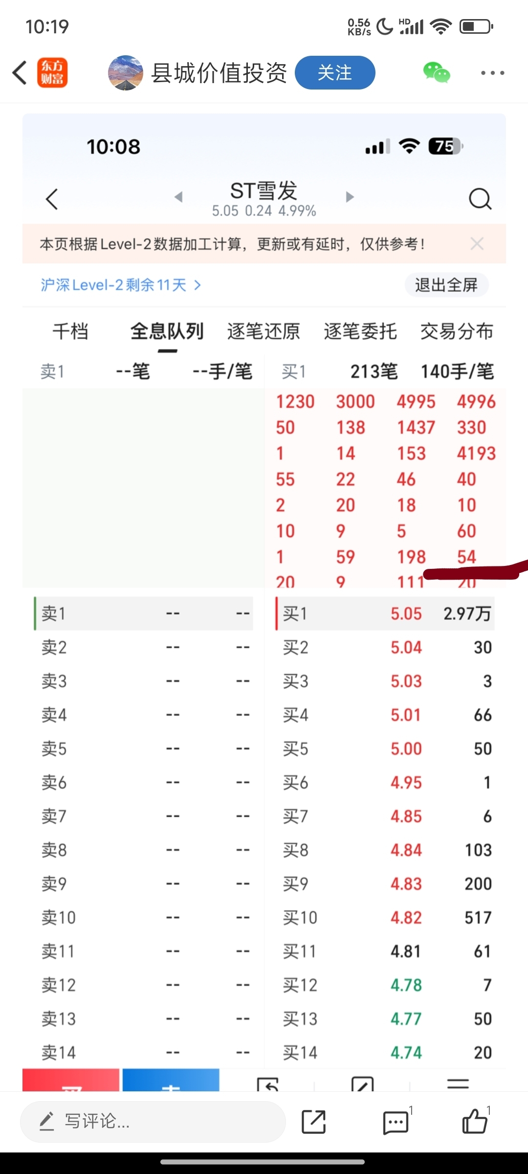 $ST雪发(SZ002485)$ 这个54手是我的,今天能成交吗?