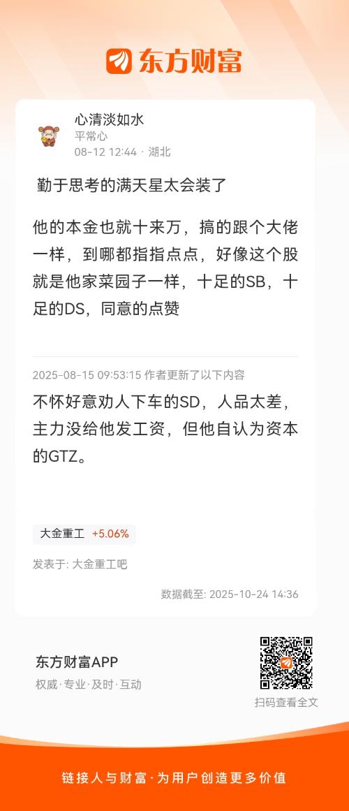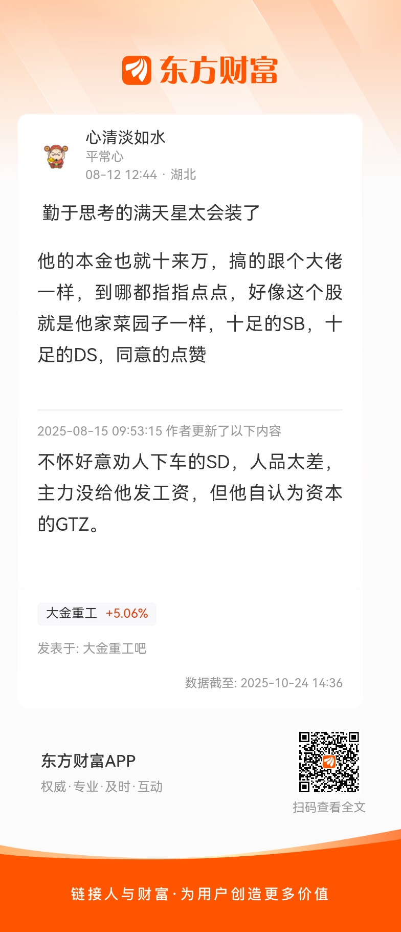 他的本金也就十来万,搞的跟个大佬一样,到哪都指指点点,好像这个股就是他家菜园子一样,十足的SB,十足的DS,同意的点赞