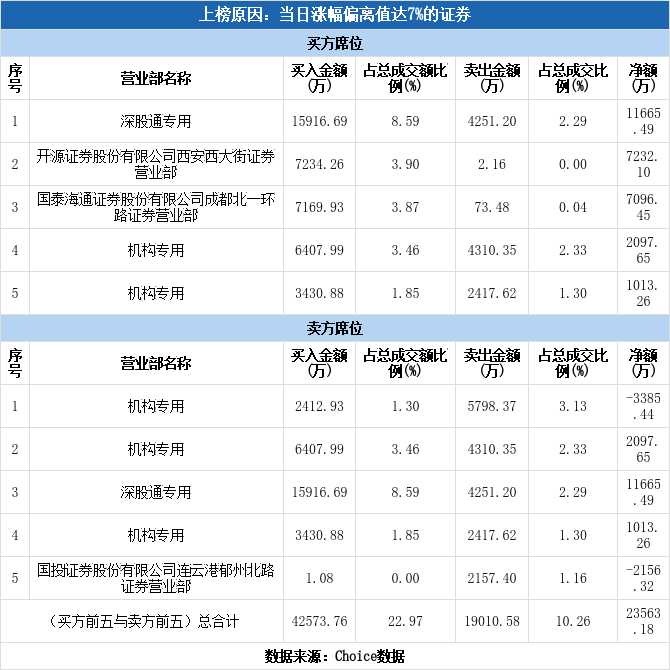 今日龙虎榜单上出现了深股通的身影,占据了买一、卖三的位置,净买入1.17亿元,占当日成交总额的6.29%。除此之外深股通还参与到了赛微电子、通宇通讯、平潭发展等9只个股中,其中5家呈现深股通净买入,获净买入最多的是通宇通讯,净买额为1.87亿元;4家呈现深股通净卖出,遭净卖出最高的为赛微电子,净卖额为2.47亿元。