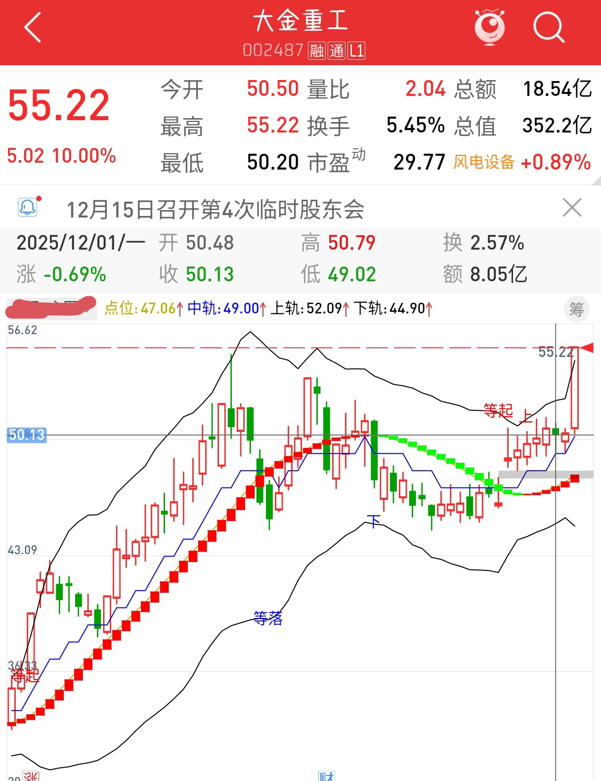 在图中最后一个“等起”出现后,等到趋势线变红了就逢低做多,也就是尽可能的让价格靠近绿色中轨然后买入。另:缺口回补也要看情况。