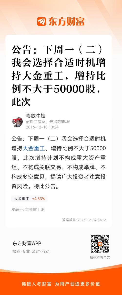 公告:下周一(二)我会选择合适时机增持大金重工,增持比例不大于50000股,此次增持计划不构成重大资产重组、不构成关联交易、不构成举牌、不构成多空意见,提请广大投资者注意投资风险。特此公告。