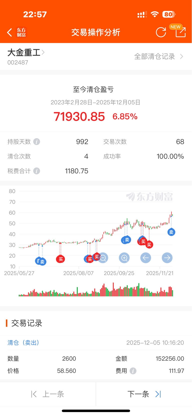 $大金重工(SZ002487)$ 感谢大金,13万亏到5.6万,到现在盈利。有缘再会