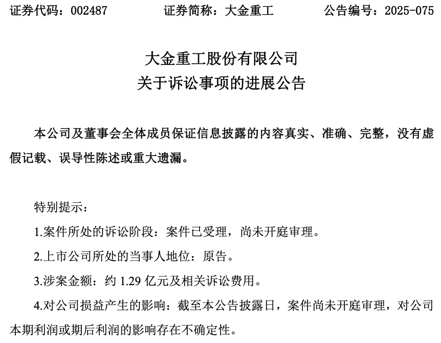 大金重工表示,截至本公告披露日,本案法院已受理尚未开庭。鉴于本次诉讼结果存在不确定性,目前暂不能预计本案对公司本期利润或期后利润的可能影响。公司将依据会计准则的要求和届时的实际情况及时进行相应的会计处理,具体以公司经审计的财务报告为准。