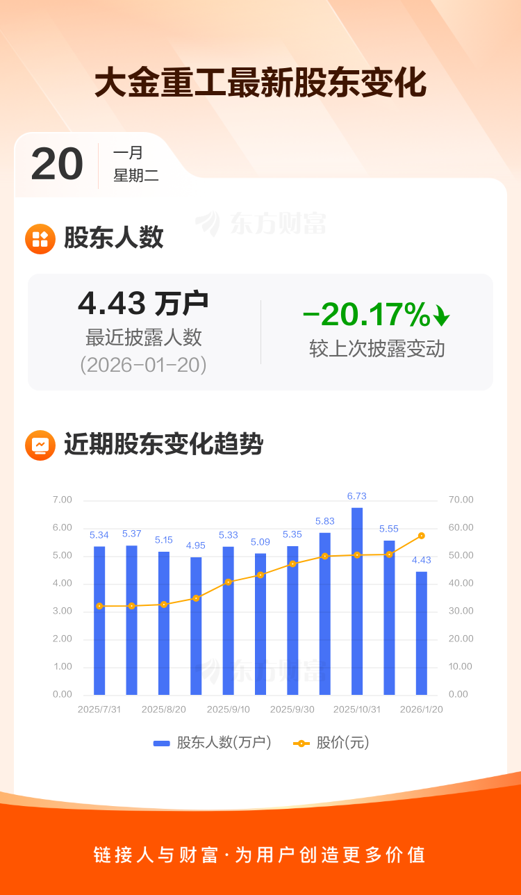 大金重工最新披露数据显示,截至1月20日公司股东户数为4.43万户,较上期(2025年11月28日)减少1.12万户,降幅为20.17%。户均持有流通股数量由上期的1.14万股上升至1.42万股,户均持股金额由上期的57.34万元增加至81.47万元。