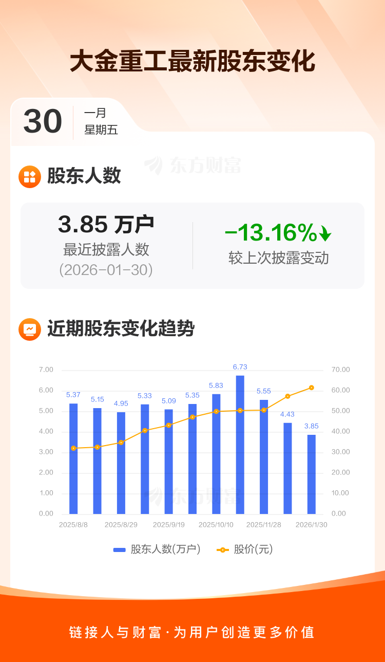 大金重工最新披露数据显示,截至1月30日公司股东户数为3.85万户,较上期(2026年1月20日)减少5835户,降幅为13.16%。户均持有流通股数量由上期的1.42万股上升至1.64万股,户均持股金额由上期的81.47万元增加至100.65万元。