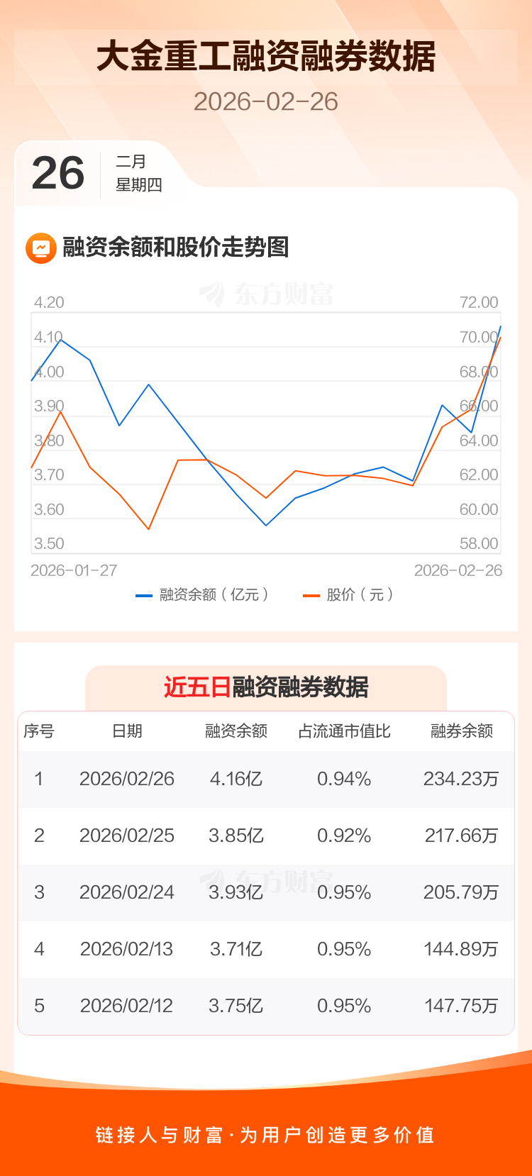 交易所最新数据显示,大金重工于2026年2月26日获融资买入1.04亿元,融资偿还7270.35万元,当日融资净买入3178.19万元。目前,该股融资余额4.16亿,占流通市值比例为0.94%。
