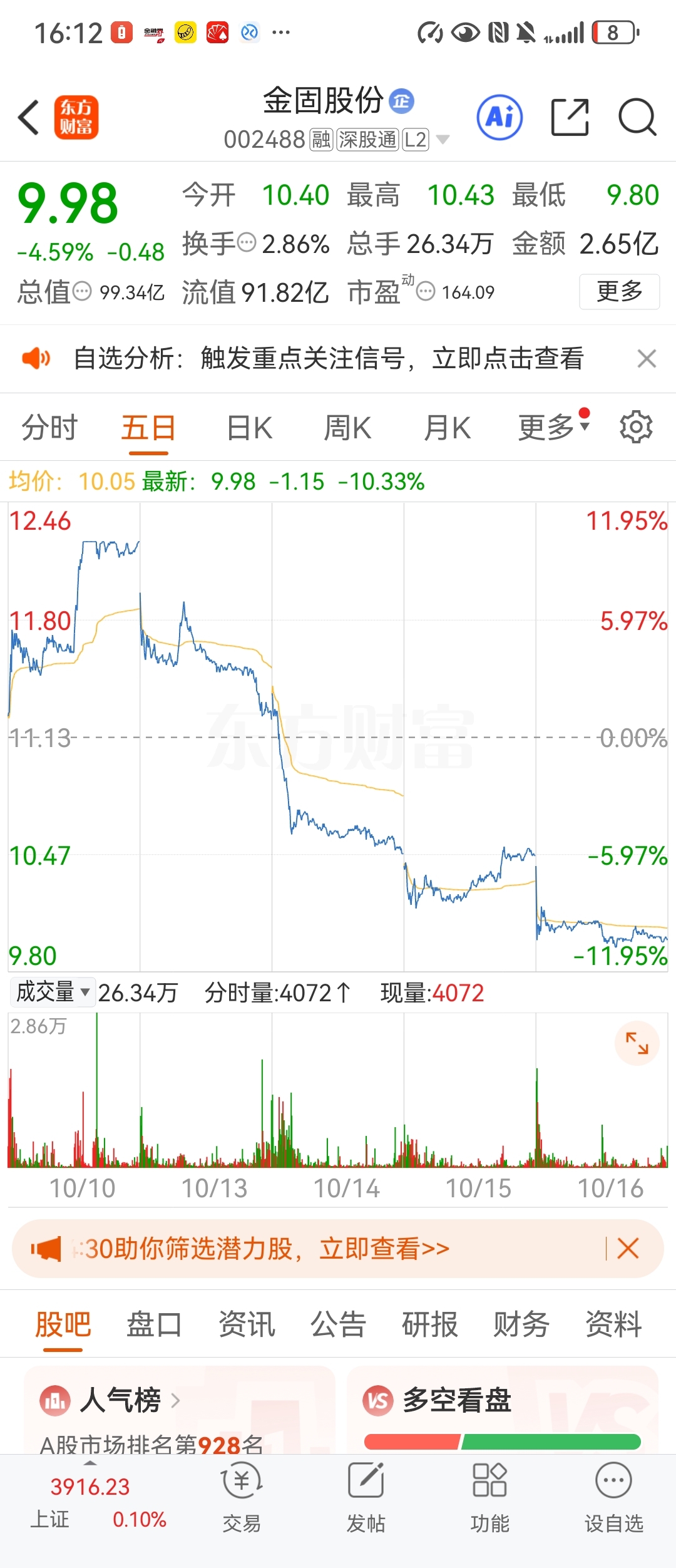 $金固股份(SZ002488)$ 分析这五日走势,早盘十分钟内,大单卖出,瞬间把价格杀到负5%,然后横盘在负5-6,再拉升 或继续下杀到跌停附近,感觉是在下方吃筹码。有没有高手分析下量价关系?