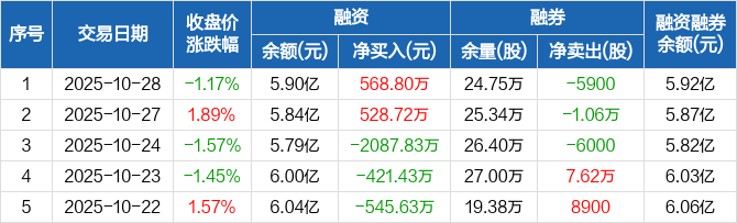 融资方面,当日融资买入1453.16万元,融资偿还884.36万元,融资净买入568.8万元。融券方面,融券卖出2.06万股,融券偿还2.65万股,融券余量24.75万股,融券余额249.98万元。融资融券余额合计5.92亿元。