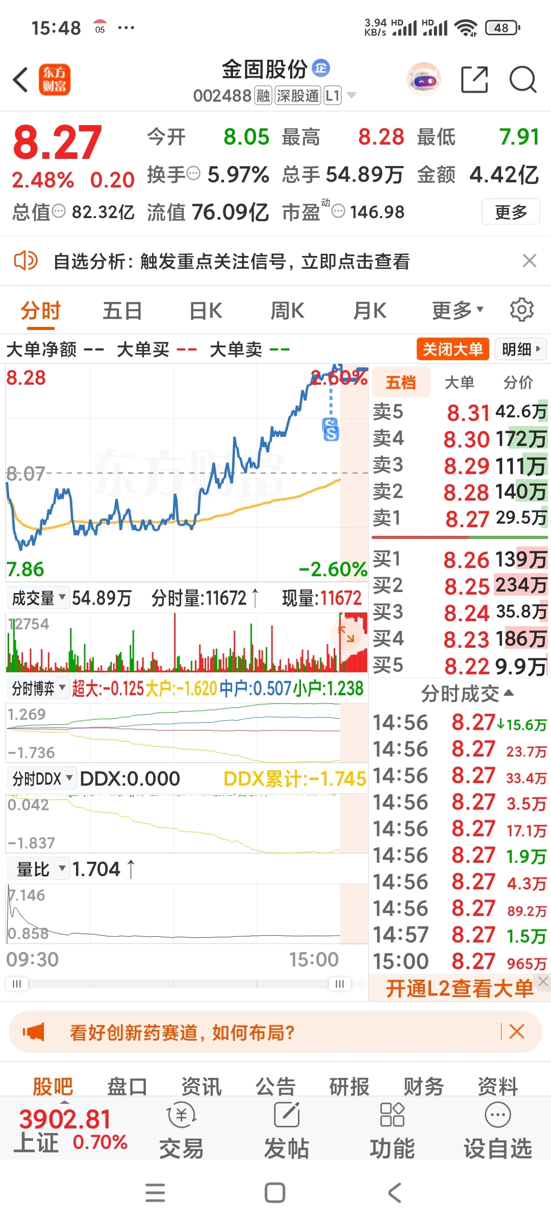 $金固股份(SZ002488)$ 不管对错先把8.05补的出了!毕竟还不能确定这里是底部!看看接下来15分钟向下不创新低8.05附近在接回来吧!我相信底不是那么容易形成的,除非有效突破8.44!可能会看到拉回10.55的过程!这里过去了才是反转的形成!路还很遥远!走一步看一步吧…
