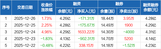 金固股份:融资净偿还171.31万元,融资余额4.26亿元(12-26)