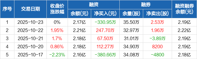 融资方面,当日融资买入765.78万元,融资偿还1096.73万元,融资净偿还330.95万元。融券方面,融券卖出3.99万股,融券偿还1.46万股,融券余量35.5万股,融券余额129.93万元。融资融券余额合计2.19亿元。