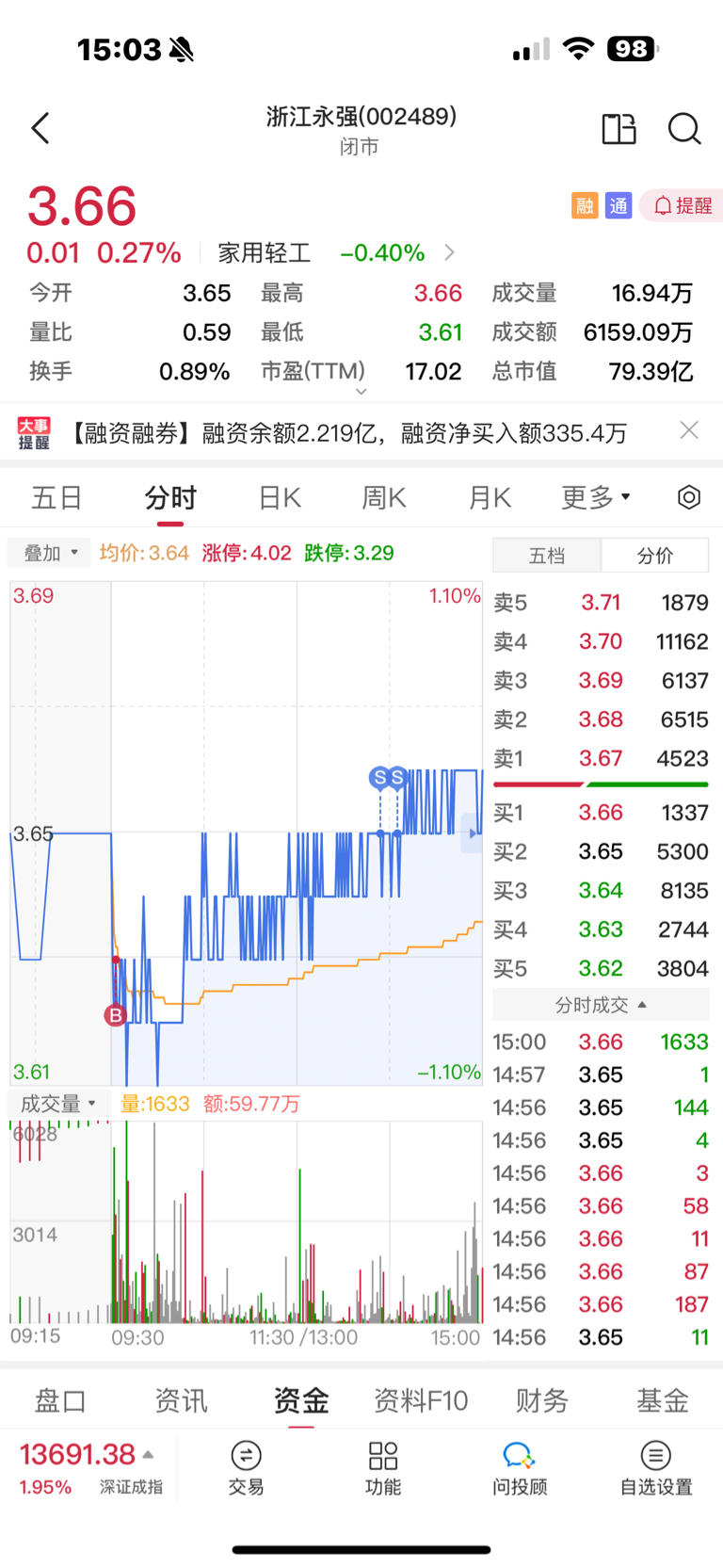 $浙江永强(SZ002489)$ 最后一小时想不到永强居然这么《强》换位思考实盘交易感觉! 明天继续上班工作啦风险管理可控! 做乌鸭嘴一点都没有作用?交易时间《谁》来听乌鸭叫!?做人要厚道! 与世无争!与时俱进!