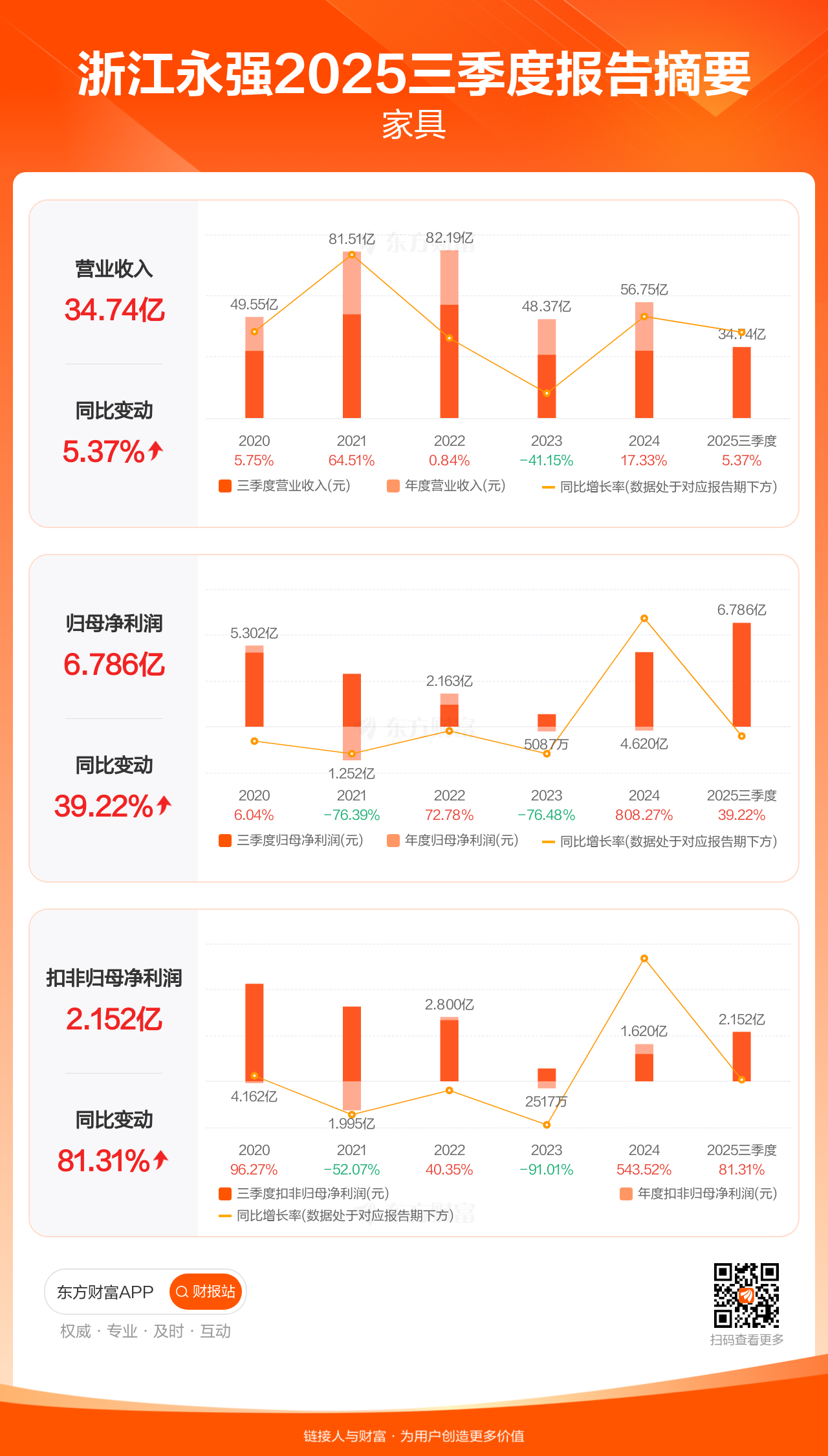 浙江永强10月31日发布2025年三季报显示,公司前三季实现营业收入34.74亿元,同比增长5.37%;归母净利润6.79亿元,同比增长39.22%;扣非归母净利润2.15亿元,同比增长81.31%。
