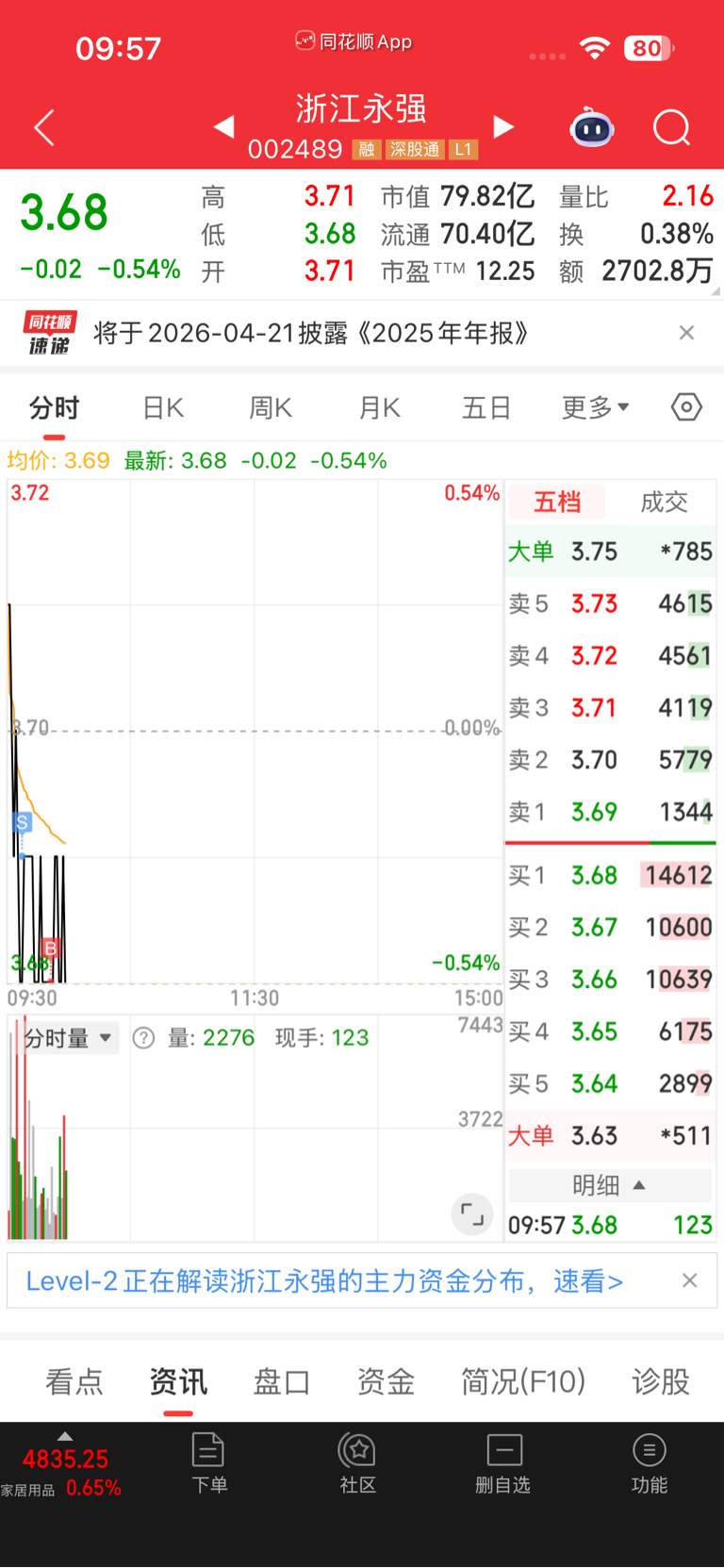 $浙江永强(SZ002489)$ 小仓位先T1分再说,降低147.08元成本