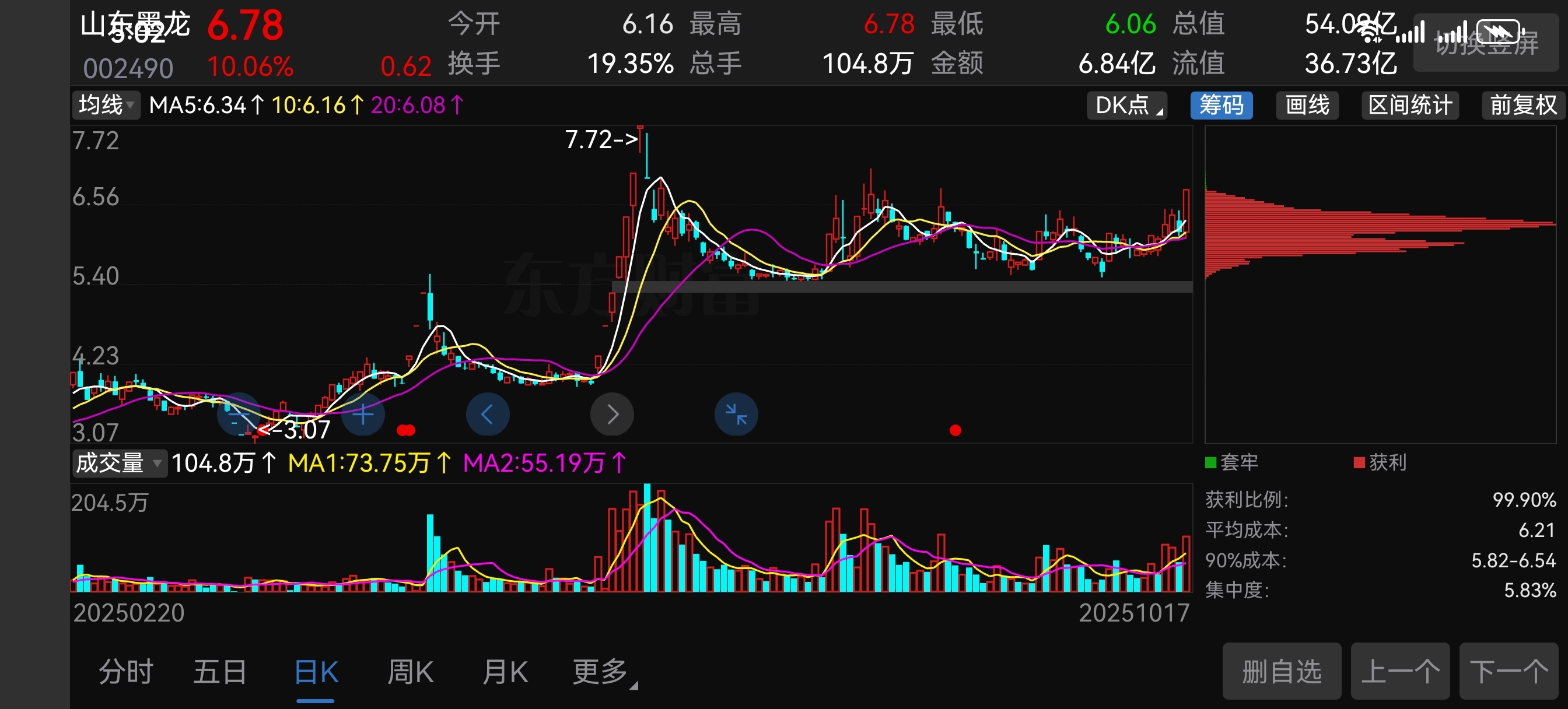 大A墨龙横盘三四个月,筹码高度集中。本周前几个工作日成交量温和放大,周四还故意下杀洗盘,周五逆势涨停,最高峰时巨量100多万手封死涨停。周五哀鸿遍野,4800只股票下跌,主力选择在这一天强势涨停,绝非一时心血来潮,而是谋定后动,志存高远。周五站稳6.78元,这是6月底至今四个月以来收盘最高价,非常强势。下周一继续涨停突破箱体,迎来新一轮主升浪的可能性很大。