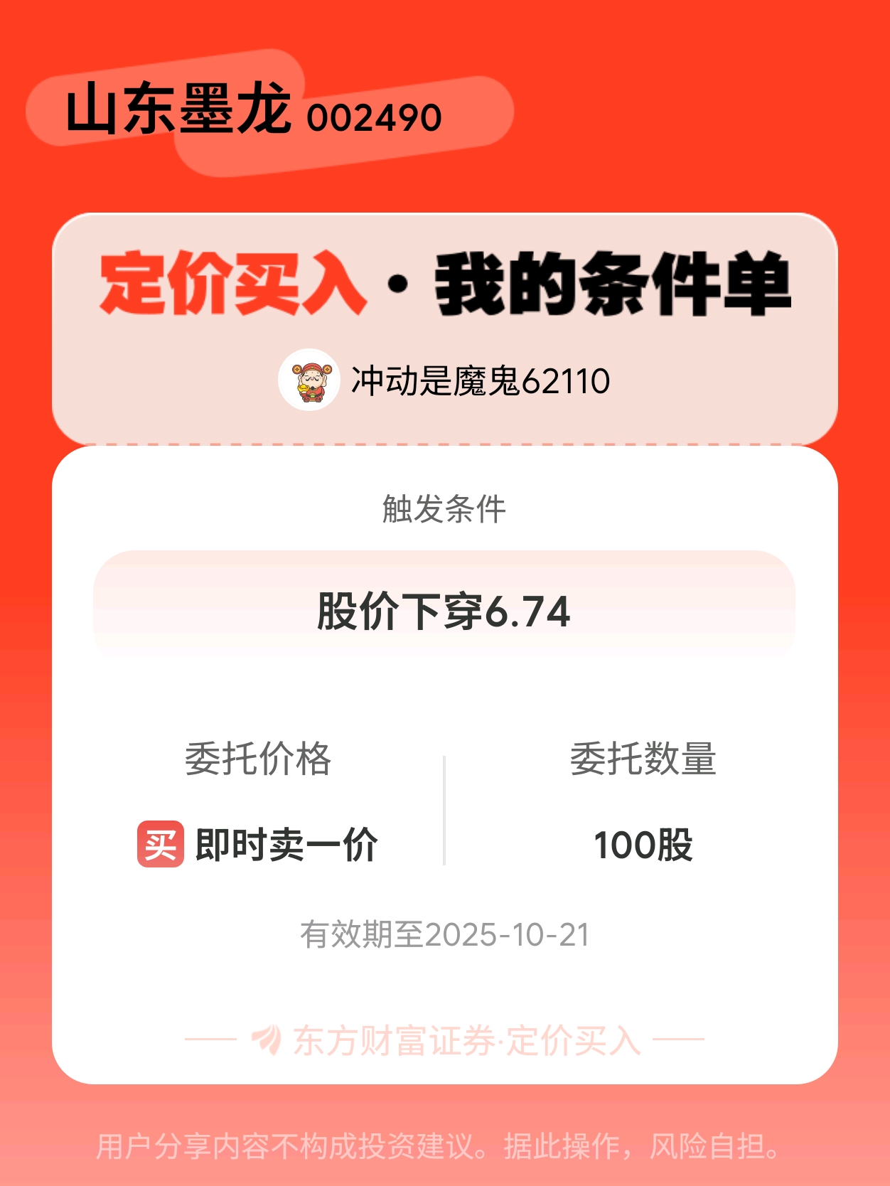 #条件单交流# #定价买入晒单# 一位股神设置了一个定价买入条件单,接下来就是见证奇迹的时刻~$山东墨龙(SZ002490)$