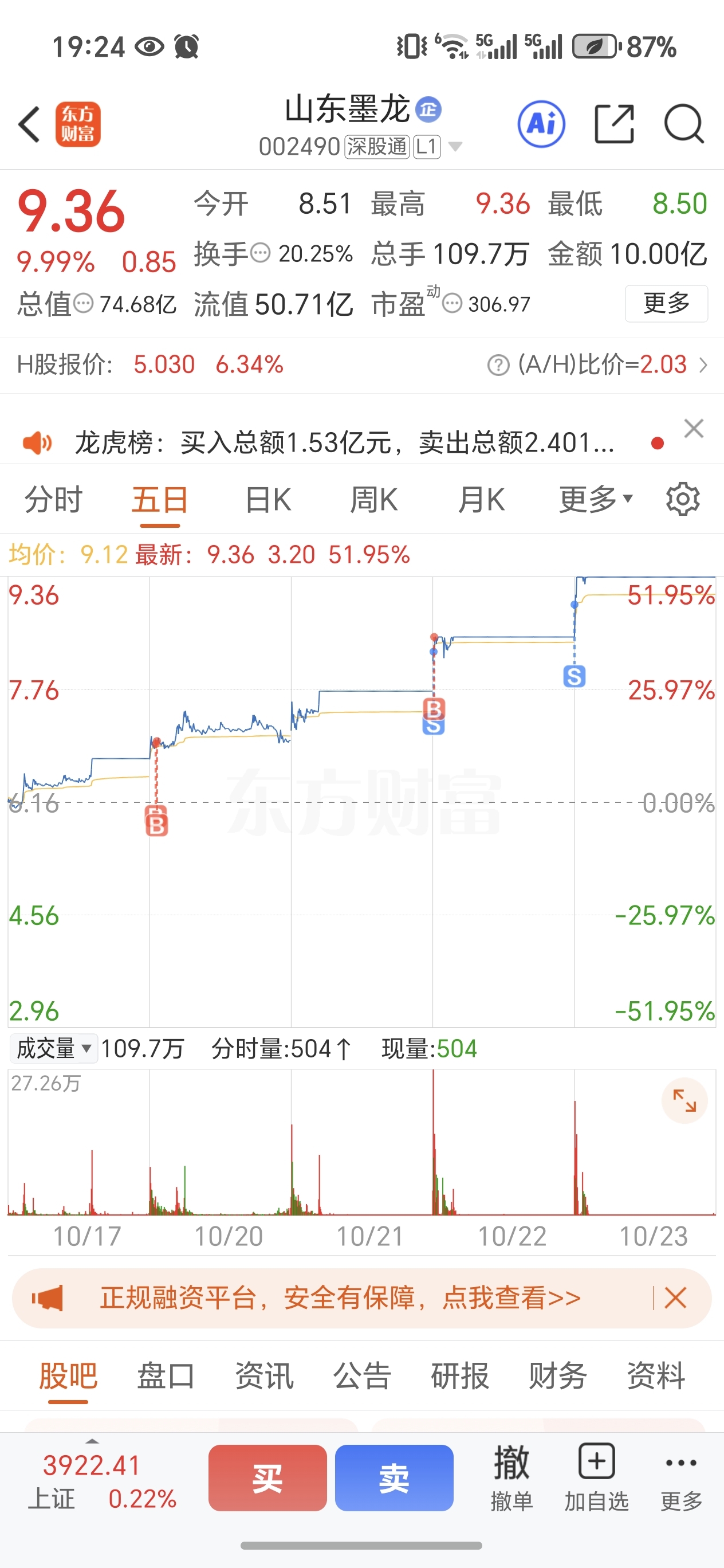 $山东墨龙(SZ002490)$ 吗的,卖飞了我龙哥