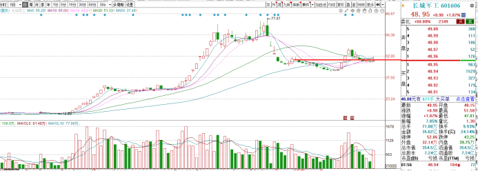 本月已经是第二次看好它了,在前期轮拉升行情中都是精准把握到了。该股亮点还是很多的,是兵装集团旗下企业,在迫击炮,单兵火箭弹等弹药武器装备有重要地位。最大亮点还是在今年年初收到了兵装集团重组通知,在那波行情中它也是军工是核心头部,辨识度还是非常高的。技术上,前期拉升明显带量出来说明有大单流入,而最近下跌则明显缩量,说明流出姿金有限。短线很明显已经得到企稳,昨天早盘放量拉升开始有姿金逢低流入了。这根上影线阳线有仙人指路趋势,早盘集合竞价若能在水上开,走出反包阳线希望就非常大了。早盘继续放量走强则重点观察,若弱势震荡回落继续观望,策略是在水上研究。